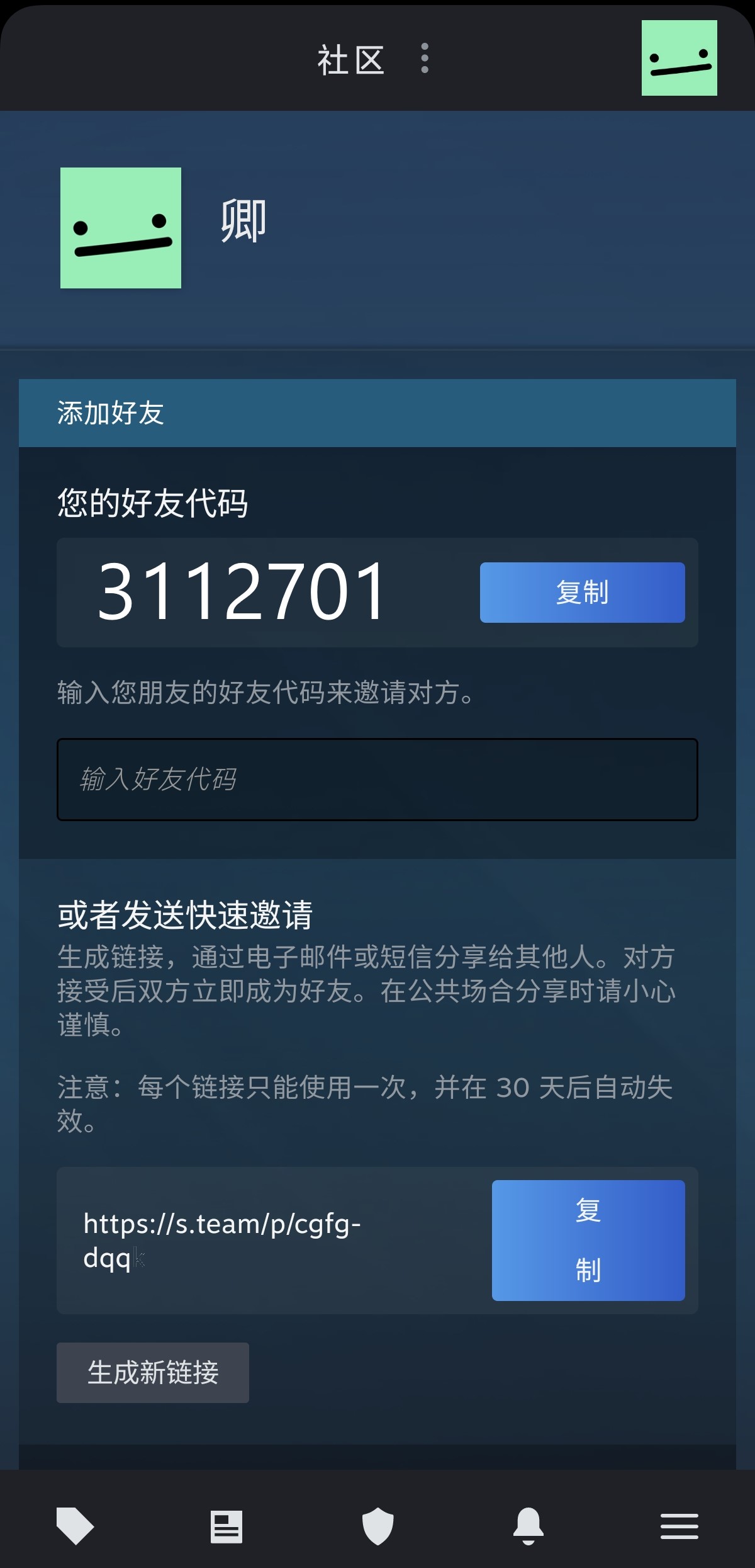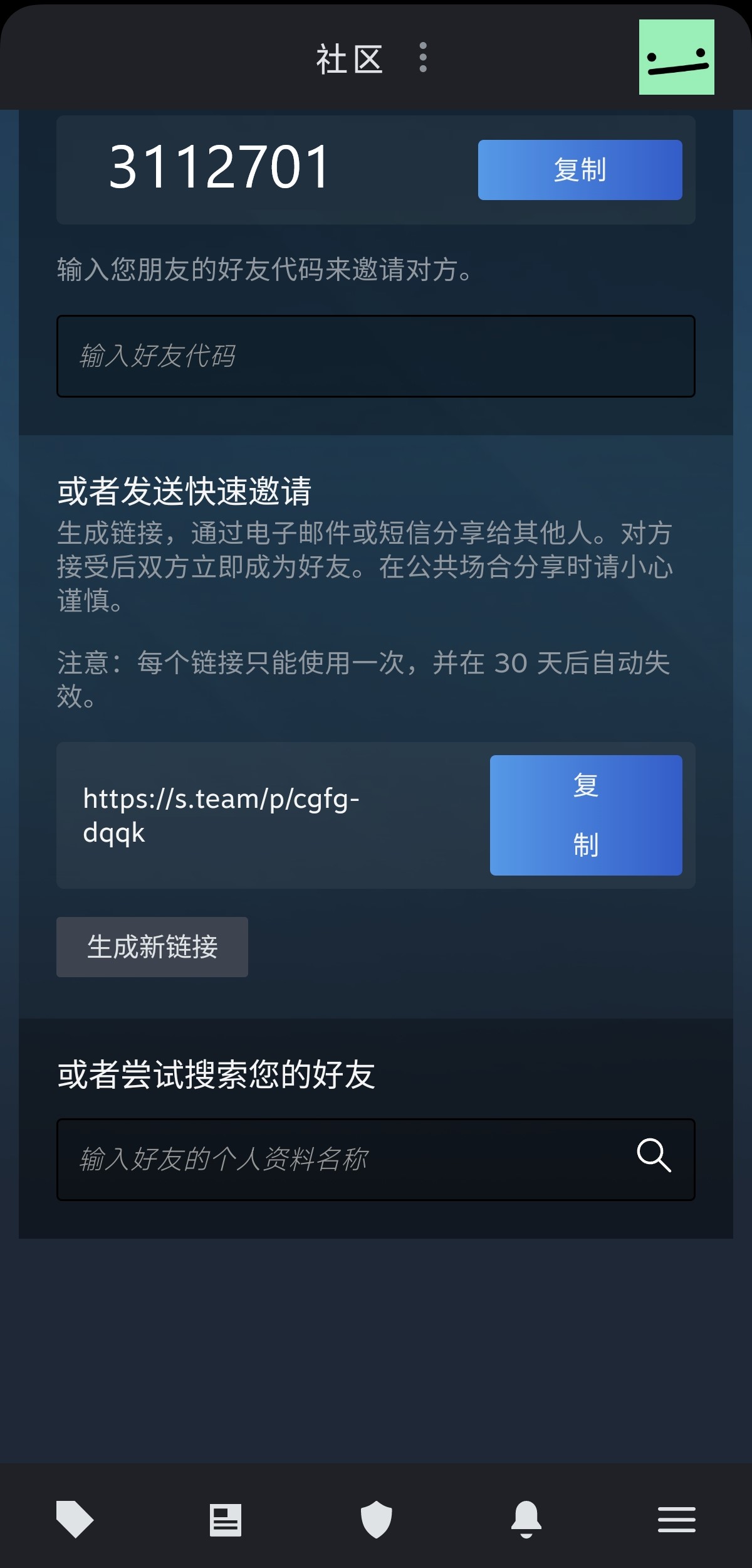 3、自己的好友码可以复制给其他人进行添加,在下面输入好友代码即可添加,下方快速邀请链接,复制发送给好友点击即可添加。