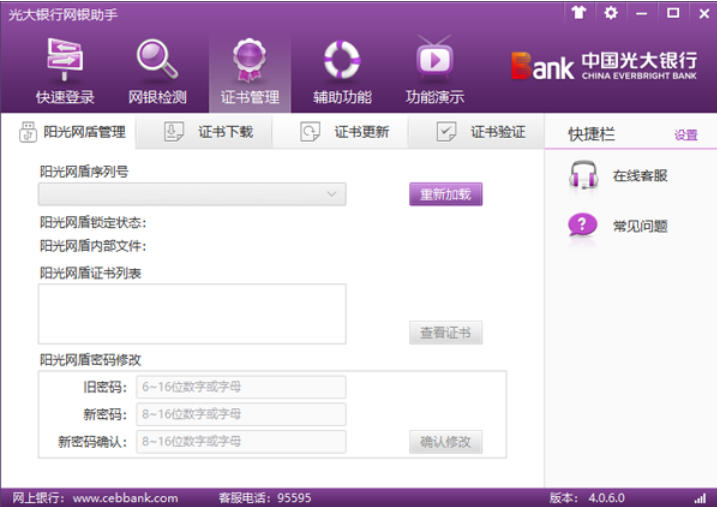 证书管理:包括阳光网盾管理、证书下载、证书更新、证书验证等功能,帮助用户管理网银证书,保证证书的有效性和安全性。