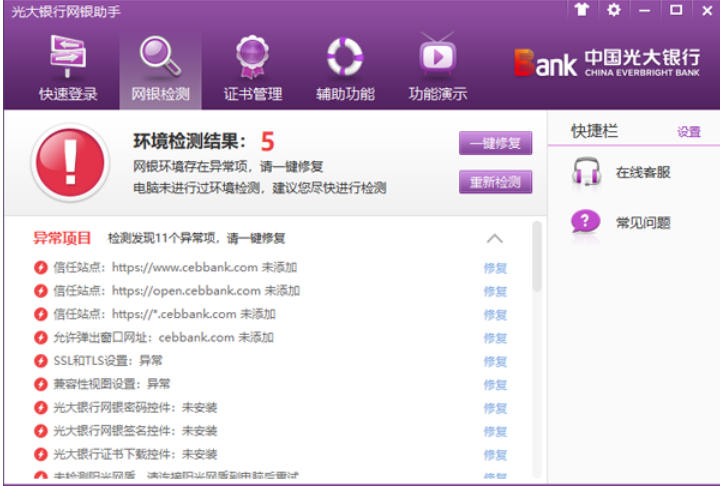 网银检测:对计算机系统进行全面检测,确保光大银行网银环境正常,为用户提供安全的网银使用环境。