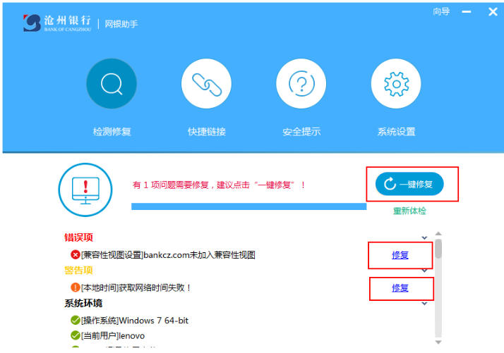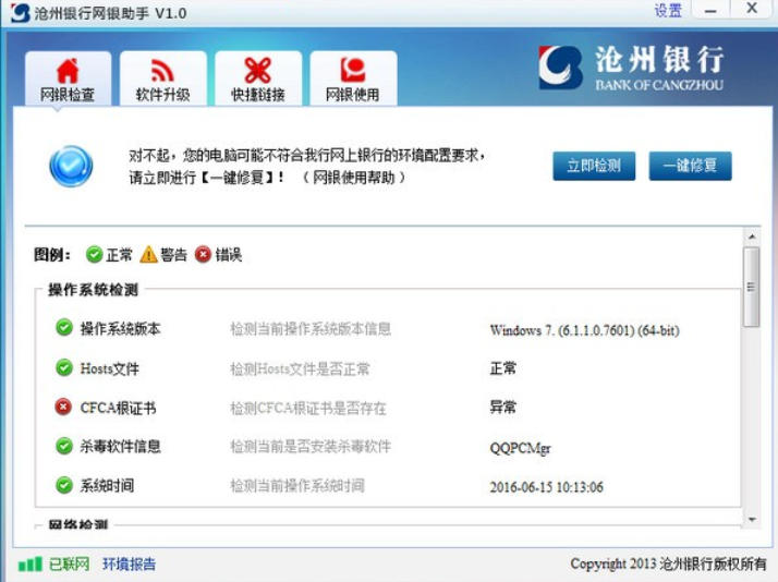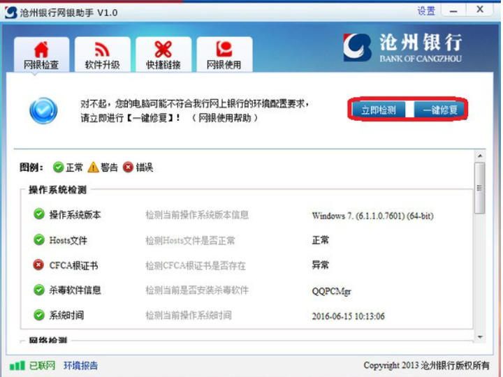 环境检测与修复:首次启动后点击 “立即体检” 或 “检测修复”,可自动扫描系统环境,一键修复控件缺失、浏览器兼容等问题,保障网银运行环境的正常与安全。