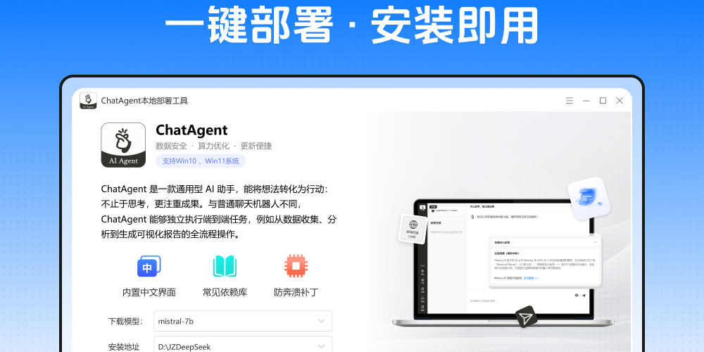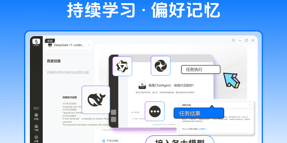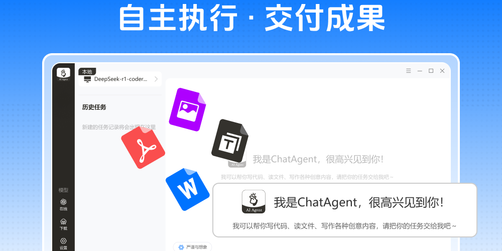 ai agent本地部署,通用型ai智能体助手本地安装,chatagent本地部署工具是一款简单易用、功能超强的通用型ai agent本地化一键安装部署软件,免去繁琐配置流程,零基础用户也能快速部署属于自己的通用型ai智能体。chatagent的核心优势在于“不止会思考,还会提供结果”,凭借独立思考和系统规划,灵活运用各种工具,在自己的虚拟环境中高效完成任务。可以帮您:编写和执行代码、智能浏览网页、操作各类网页应用,进行如个性化旅行规划、股票分析、保险条款比较、网页开发等方面的工作。