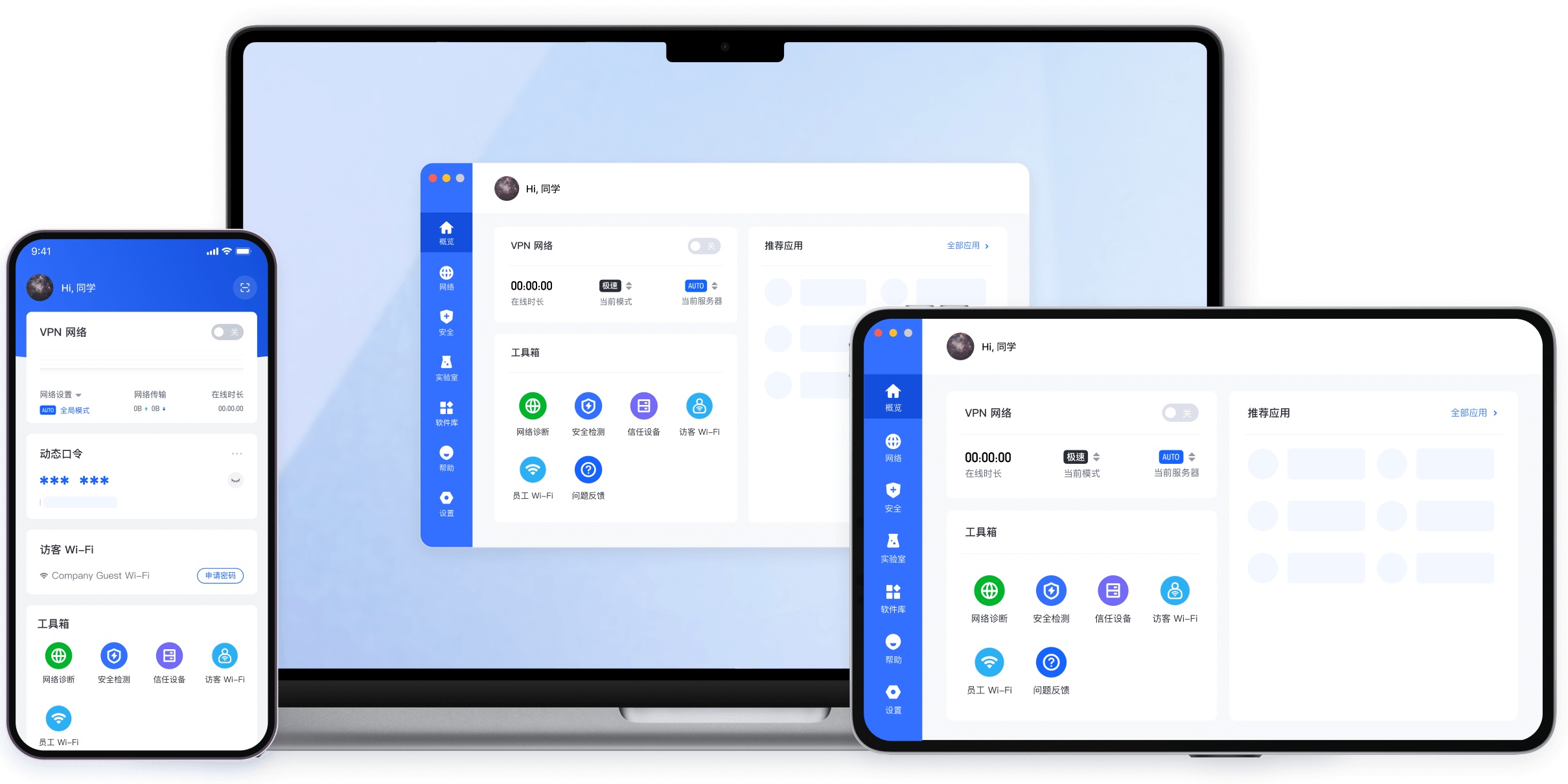 使用飞连客户端,员工仅需一个账号,便可在移动办公场景下获取所需的网络(vpn/wi-fi/有线)、应用(业务系统/云服务/公网应用等)及 it 服务资源,多端合一的方式为用户带来高效办公新体验。