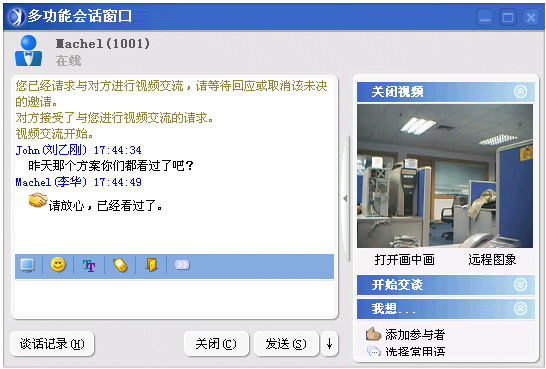 即时沟通交流:方便、快捷地即时消息发送与接收,提供不同颜色字体的文字,提供个性化展示。