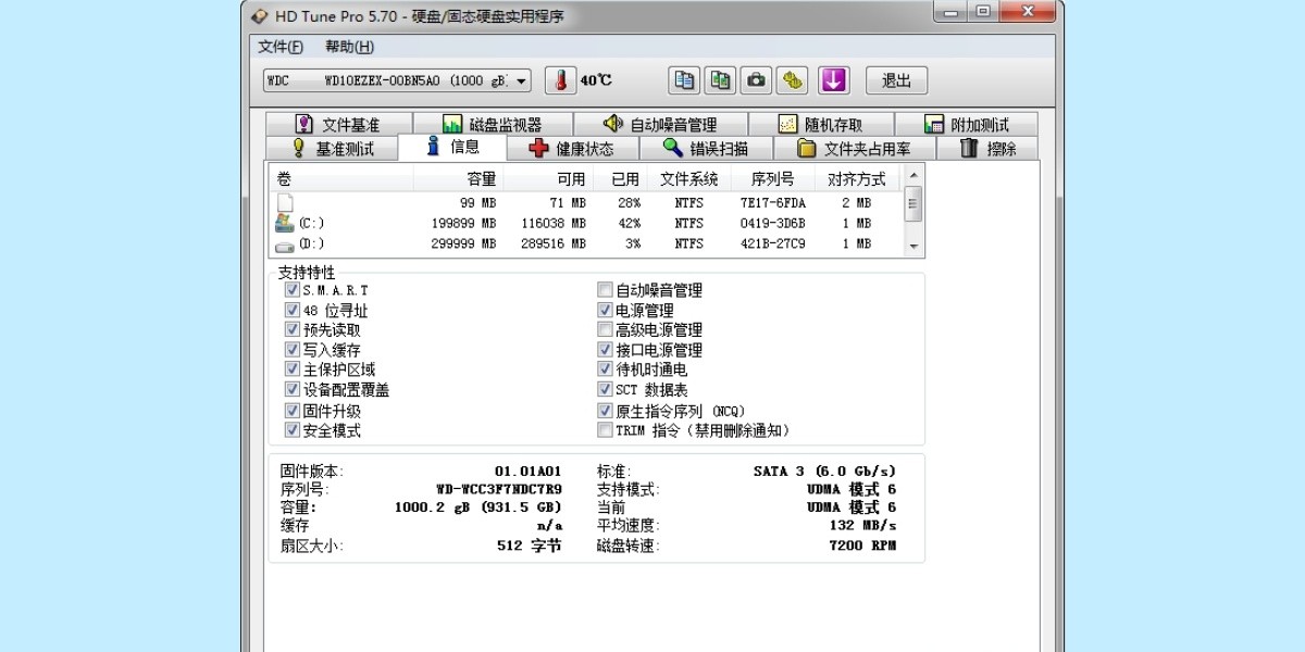 3、您可使用该程序了解您的驱动器是否支持高级功能,例如自动噪声管理、48 位地址或可升级的固件。所有这类信息和更多信息可在几秒钟内显示,而无需安装其他复杂的程序。