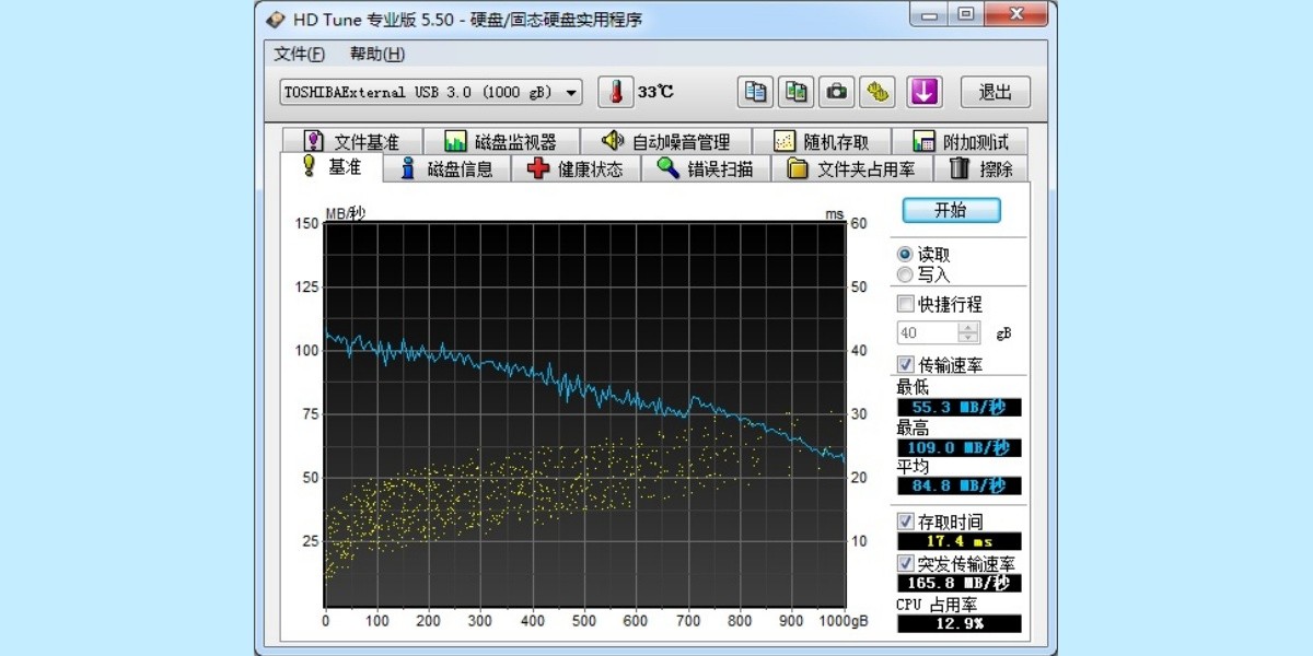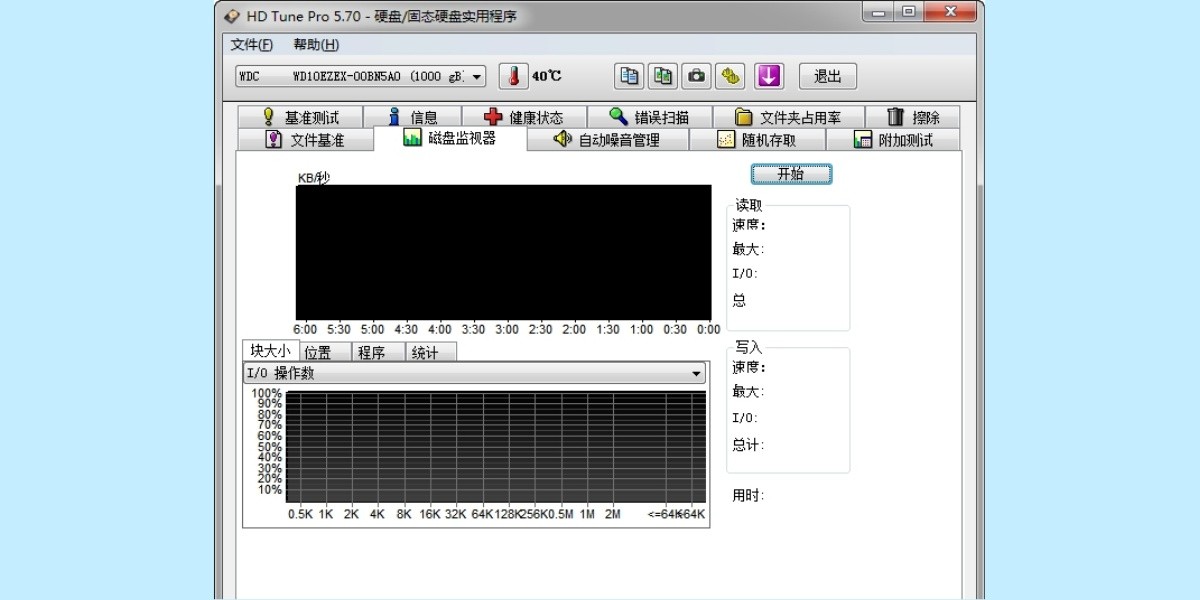 2、可执行大约十种类型的关于传输速率信息的测试,包括随机寻道、顺序模式和突发速率测试。