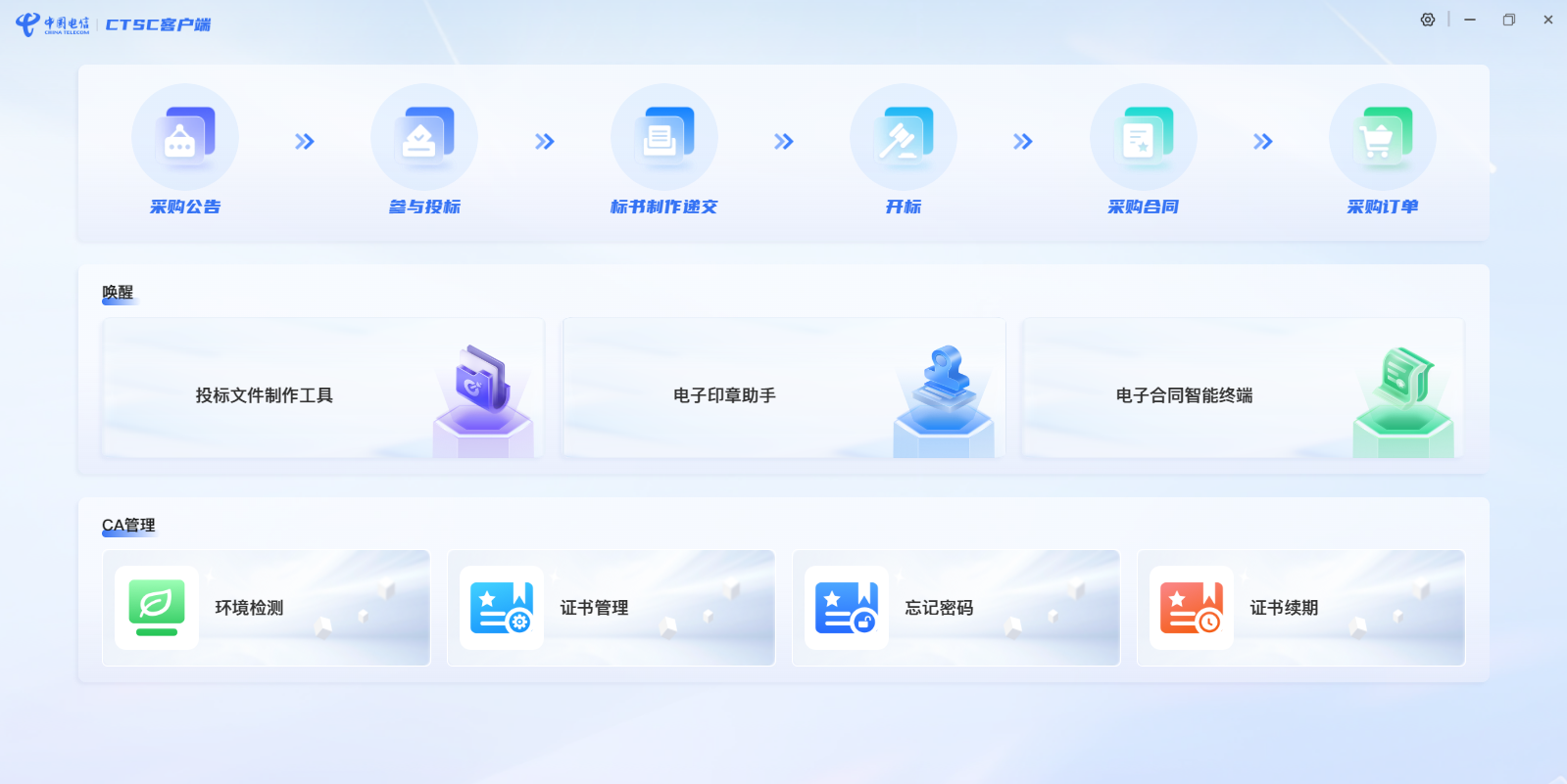 ctsc客户端,具有ca管理、pc软件唤醒等功能模块,支持供应商投标文件制作、合同订单盖章等业务,集中配置,统一管理,提升用户体验,增强数据集中和分析能力。