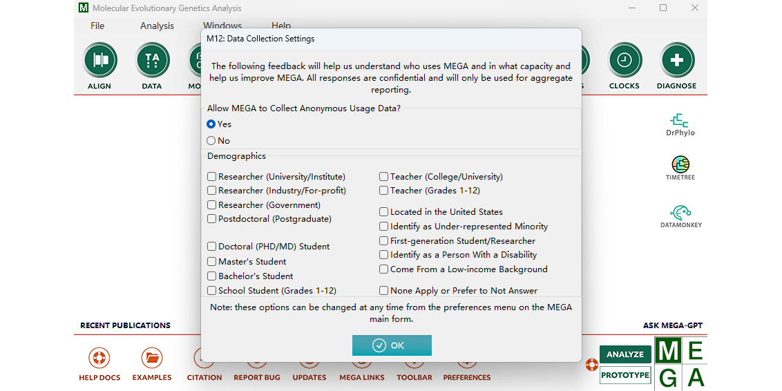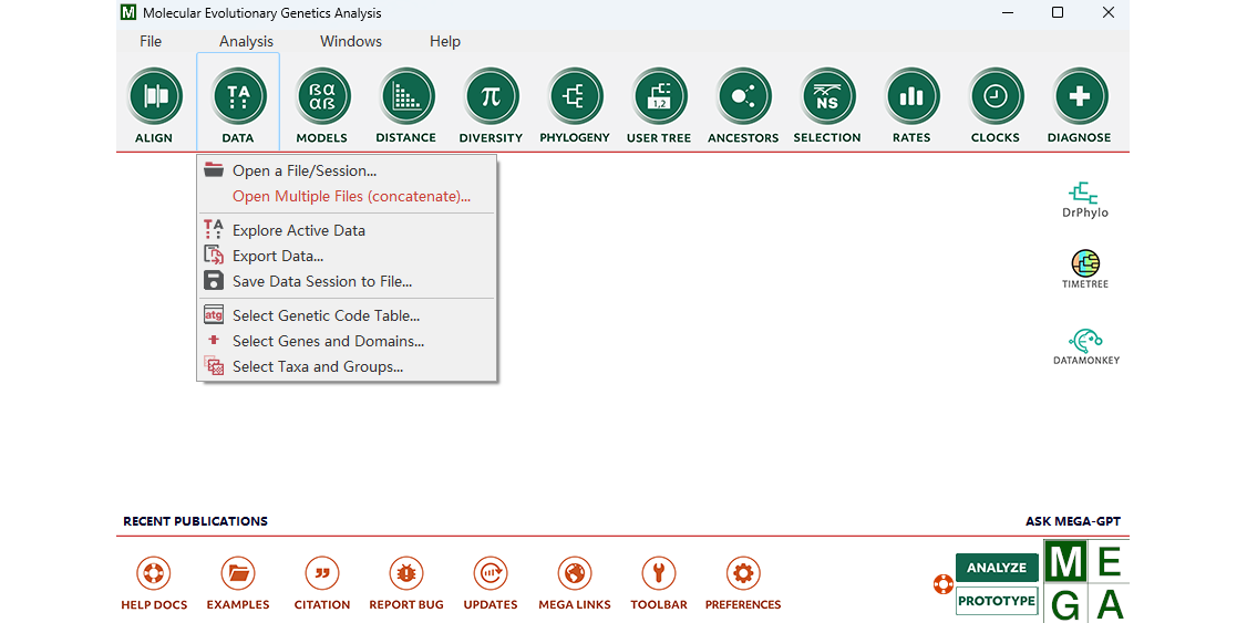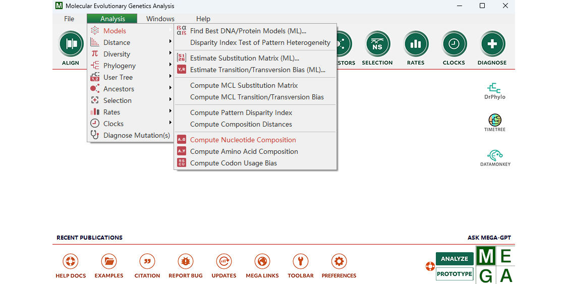 mega是一款分子进化遗传分析软件,经常用于分子遗传学方面的研究,支持打开估计替代矩阵,支持估计转换/转换偏差,支持计算mcl替换矩阵,可以编辑序列的数据、进行序列的比对、构建系统发育树和推测对比物种序列间的关联。