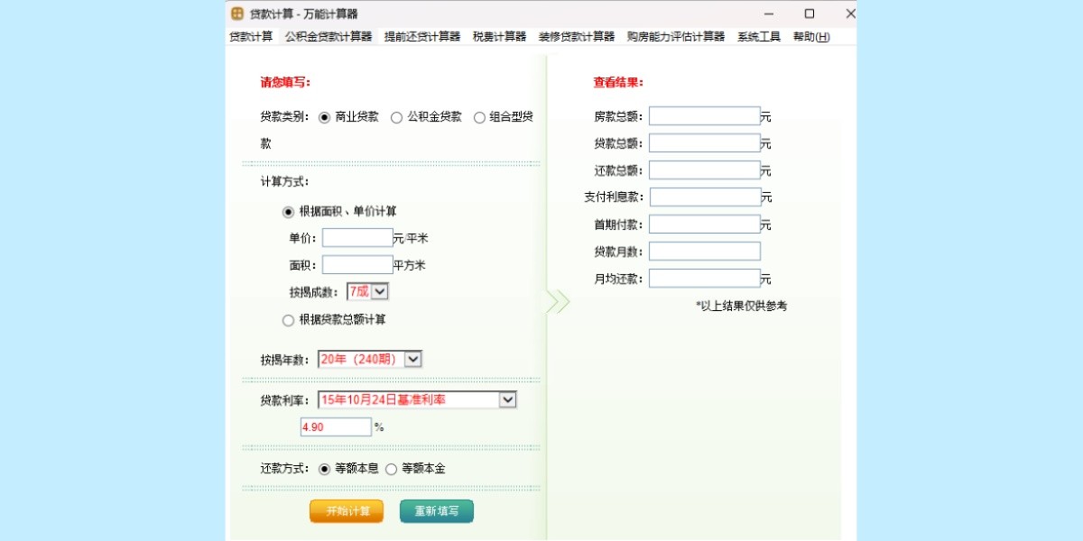 商业贷款计算器用于计算用户在申请商业贷款时,选择等额本金和等额本息两种不同的还款方式后,每一期需偿还商业贷款的月供,以及利息总额和还款总额。