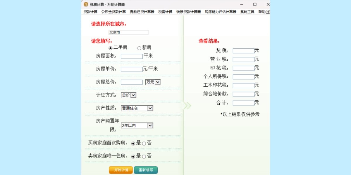 填写房屋所在地和房产信息,点击“开始计算”一键知晓房款总款和各种税费,买二手房也不怕算账麻烦啦。