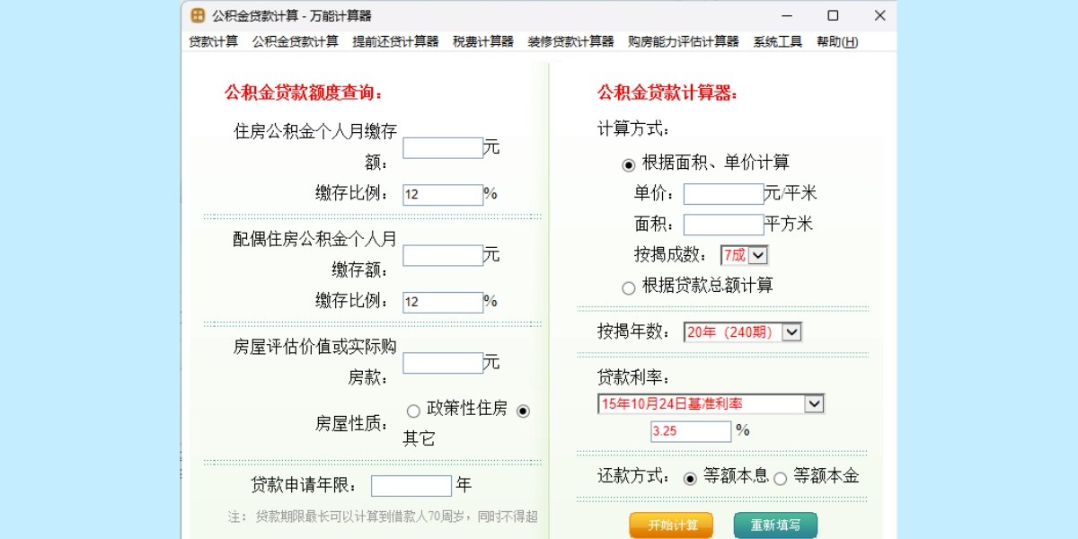 公积金贷款计算器用于计算用户在申请公积金贷款时,选择等额本金和等额本息两种不同的还款方式后,每一期需偿还公积金贷款的月供,以及利息总额和还款总额。