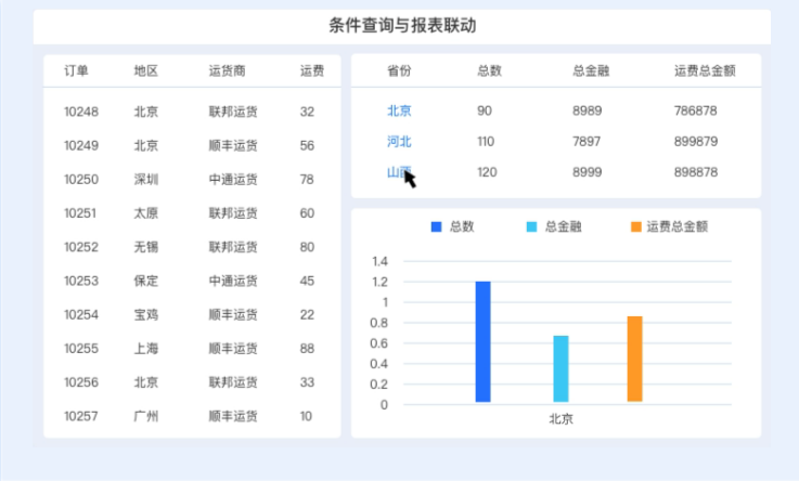 通过参数配置实现报表查询、数据过滤,以及联动、钻取分析