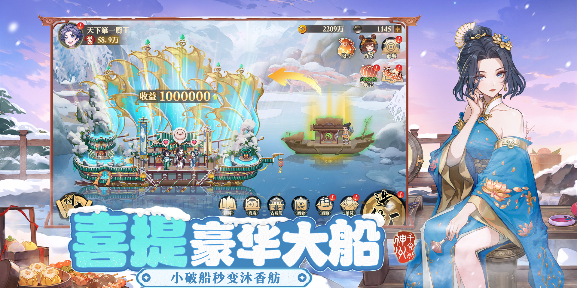 扬名整片水域,厨王争霸势不可挡!船舫规模日渐壮大,是时候来厨王争霸赛一展身手,闯入皇城赛,一朝逆袭扬名天下,做这大运河上的船王。