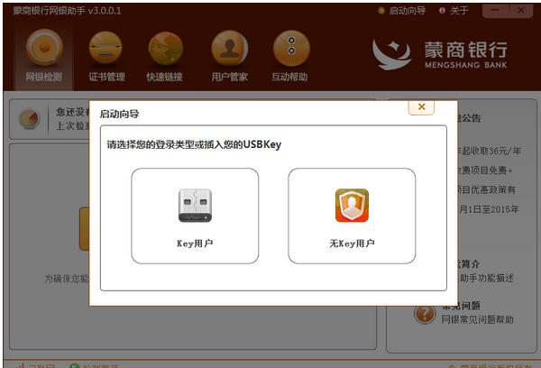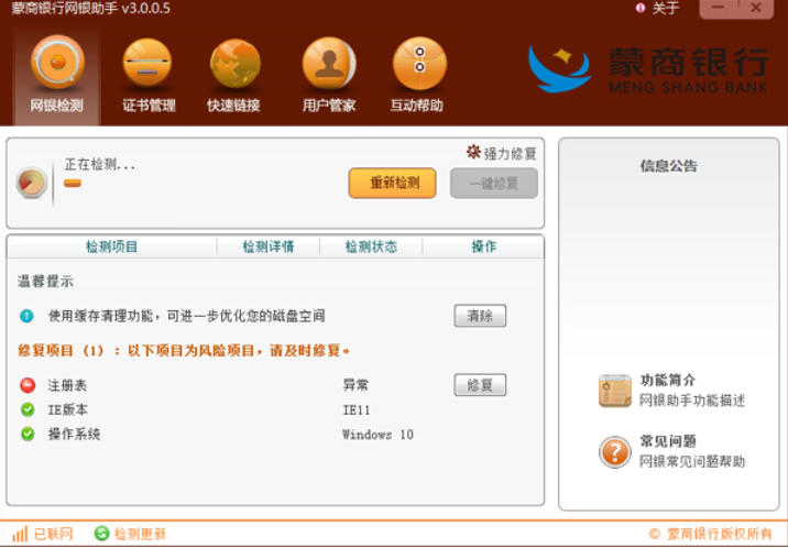 网银检测:对客户当前计算机环境进行全面检测,识别可能影响网银正常使用或安全的问题(如缺少插件、驱动异常、安全设置不当等),并可进行一键修复,确保客户能正常使用网银。