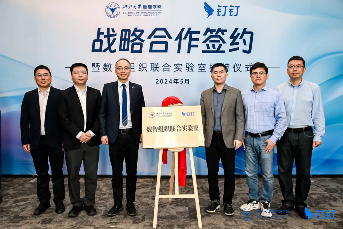 【2024年5月23日,浙江大学管理学院基于“数智创新与管理”交叉学科,携手阿里巴巴集团旗下的数字化协作办公及应用开发平台——钉钉(中国)信息技术有限公司正式签署战略合作】,共建“浙大管院-钉钉数智组织联合实验室”,共探数智变革时代下的组织管理新理论、新模式。“浙大师资力量雄厚、科研成果累累,此次能携手管院开启战略合作,我们非常珍惜,也非常期待。”钉钉总裁叶军在致辞中表示,目前钉钉在全国已有7亿多用户,从用户覆盖率来看,钉钉在赋能企业数字化转型方面的实践已位居全国前列,但在组织管理理论总结与提炼方面存在短板,浙大管院拥有数智创新与管理交叉学科和一大批组织管理研究资深学者,相信双方的合作,将帮助中国企业探索更加智慧的组织形态与更加创新的业务形态,助力新质生产力培育。期待此次双方合作共建数智组织联合实验室,能够围绕这些挑战展开深入研究,以浙大管院的数智组织创新研究能力和钉钉在技术创新方面的能力,形成“1+1大于2”的合力,进而助推“数实融合”,服务国家现代化产业体系建设与国际竞争新优势构筑。