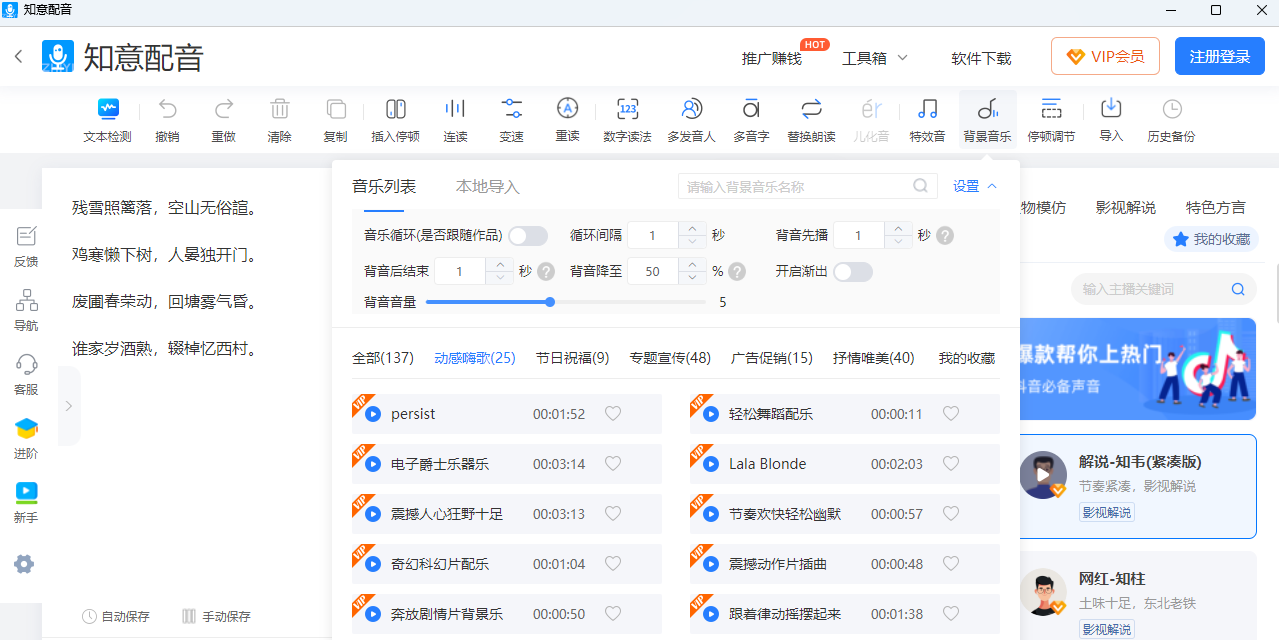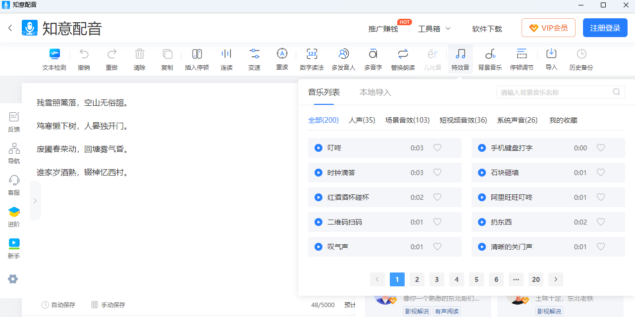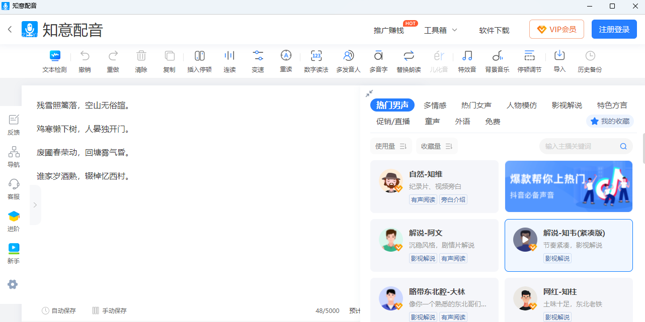 从创作时的文案检测,到创作中的效果调整,再到完成后的多样输出。知意配音提供像word一样的在线可视化配音编辑,真正提升配音生产效率,百万大v力荐!
