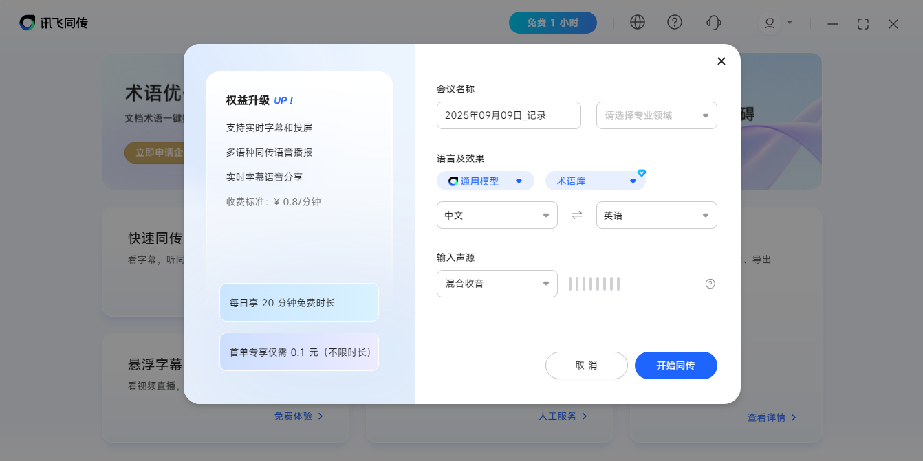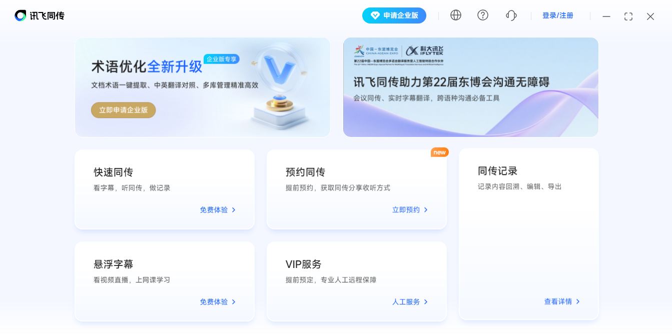 讯飞同传,基于科大讯飞的智能语音和语言技术,提供多场景多语种实时转写翻译、同声传译、直播字幕上屏和会议记录分享等一体化同传服务。讯飞同传是专业ai同声传译设备,支持实时翻译字幕,看剧神器,是跨语言工作学习帮手。