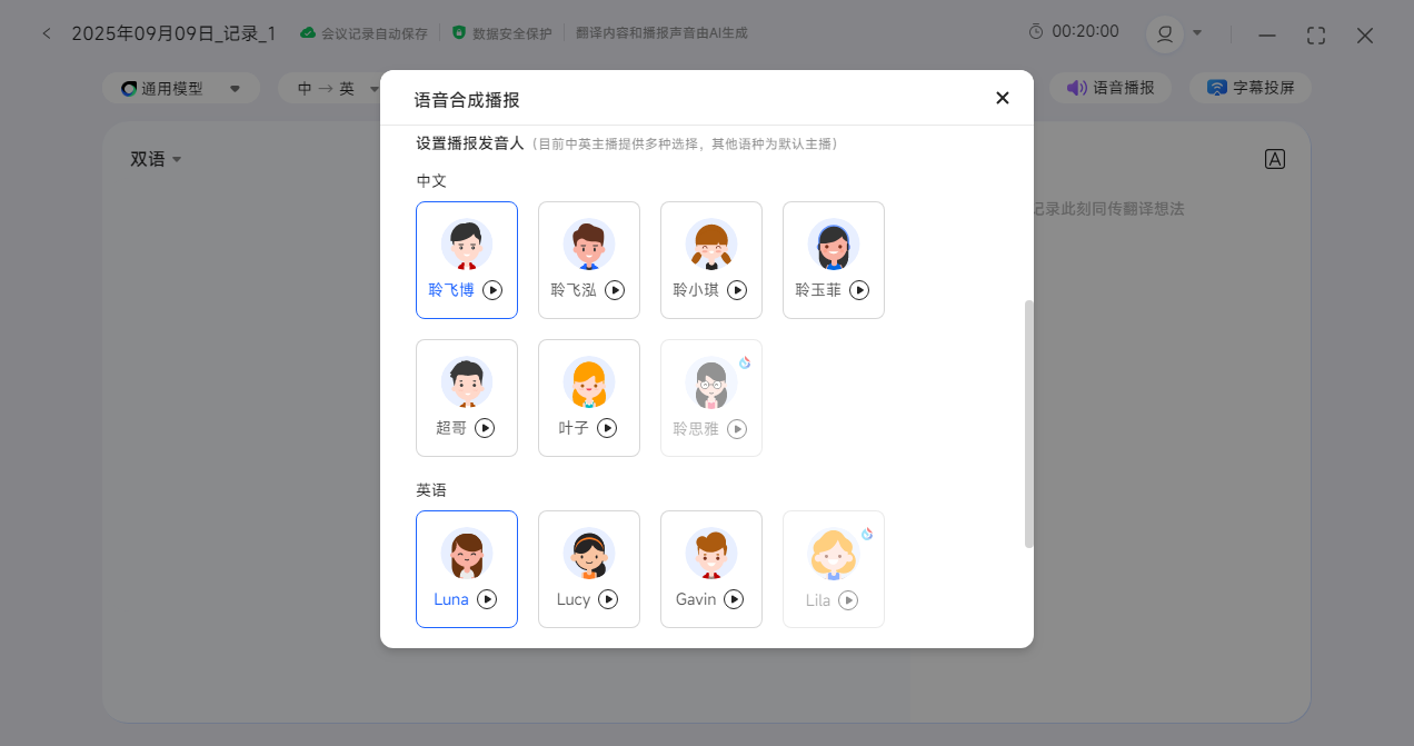 可以一键分享会议原声及翻译语音播报,提供中文和英、日、韩、法、德、俄、西班牙、意大利语、阿拉伯语、泰语、越南语、粤语、维吾尔语、藏语语种的语音合成播放,解决会议现场和在线场景看字幕、听同传的诉求。