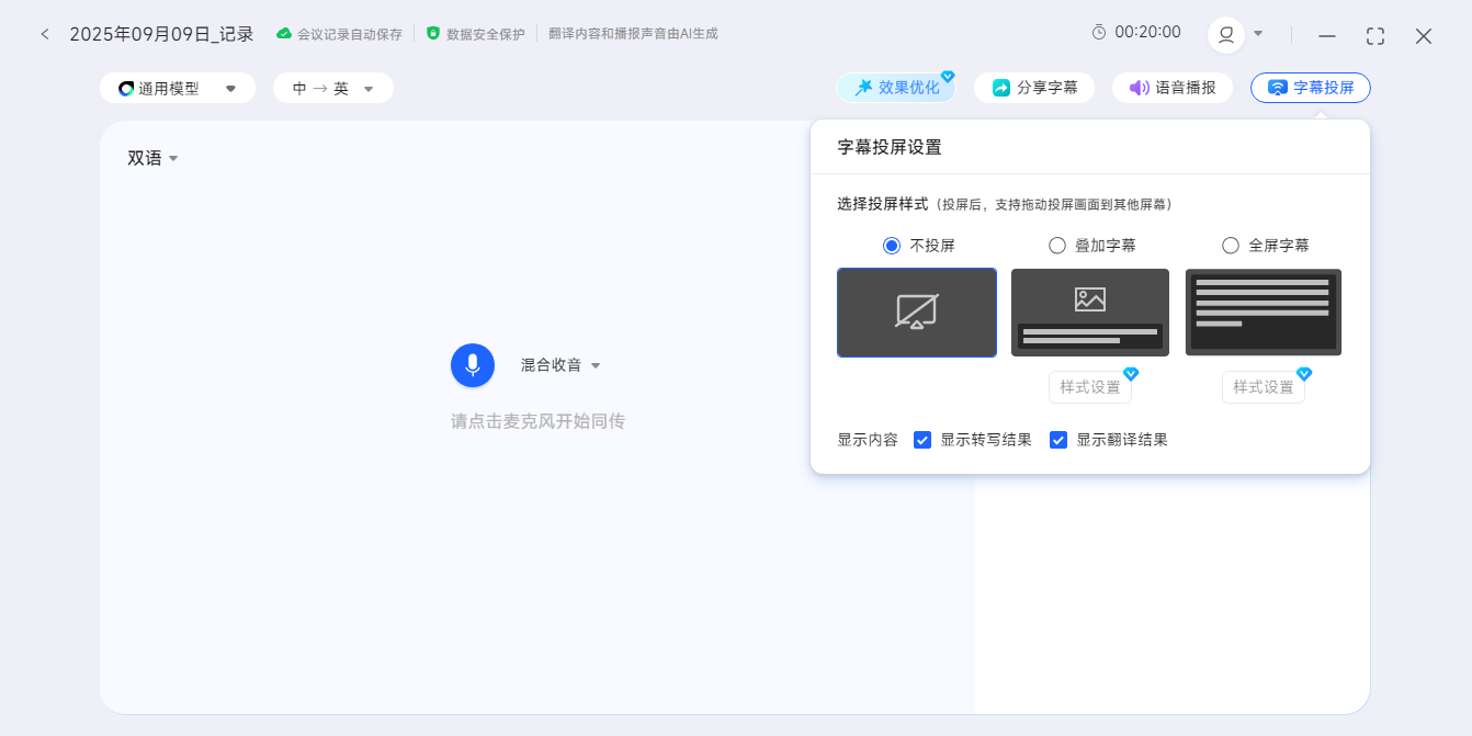 具备全屏投屏和字幕叠加两种方式,支持对字幕文字大小、颜色、logo、背景等自定义设置。
