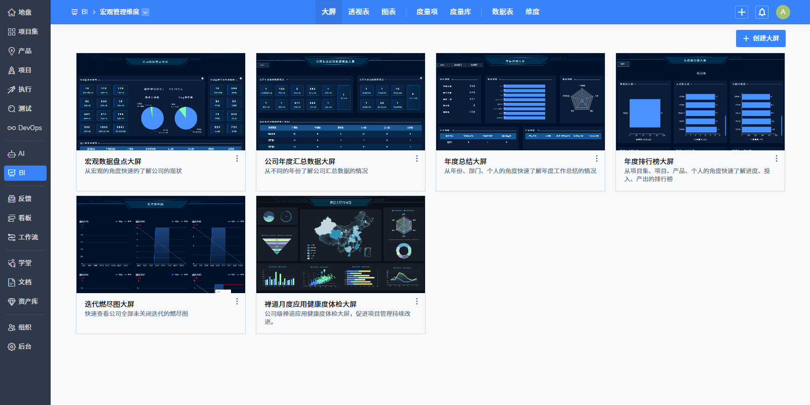 个人仪表盘、产品仪表盘、项目仪表盘、测试仪表盘、文档仪表盘等各类信息总览。