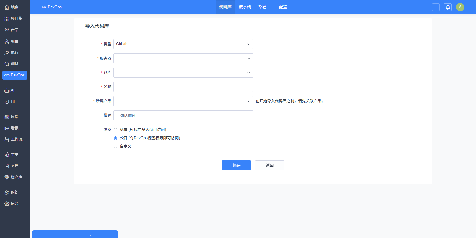 对接git服务;代码管理:代码库关联产品、浏览代码、分支列表、标签列表、代码对比、代码与需求/任务/bug关联;合并请求管理;对接gitlab流水线、jenkins流水线;手动触发、代码库事件触发、定时触发、查看历史和详情。