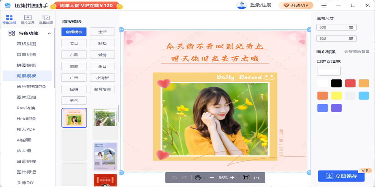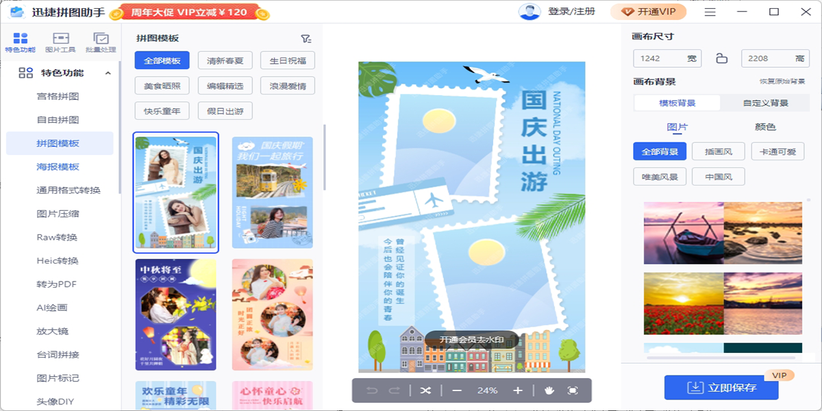 迅捷拼图助手是一款专业的照片拼图制作软件,提供九宫格拼图、四宫格拼图、海报拼图等智能拼图模板,操作简单、功能丰富,轻松完成照片拼图设计。迅捷拼图助手提供了丰富的模版可供选择,让您随心所欲的拼图。同时还支持图片转换、编辑、抠图换背景等几十种图片处理工具。让您一站式处理所有需求。