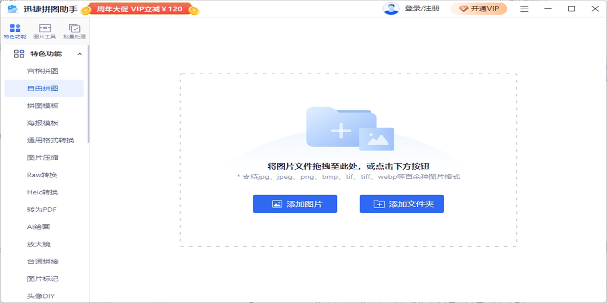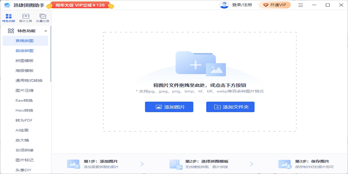 支持多种格式:迅捷拼图助手不仅支持jpg、jpeg、png等常见图片格式也支持苹果系统的heic格式、单反相机的raw格式进行相互转换