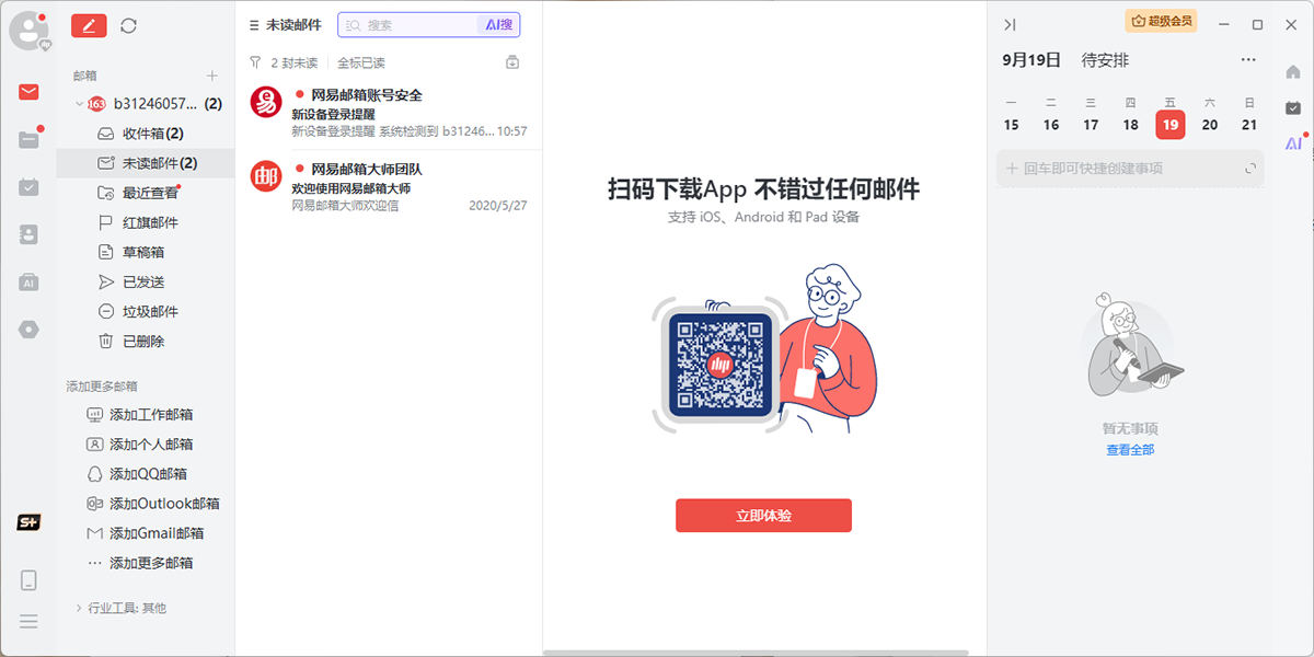 网易邮箱大师:高效强大的全平台邮箱客户端,支持一个大师账号管理你的所有邮箱客户端;支持一键添加所有邮箱:163、126、qq邮箱、outlook、hotmail、新浪邮箱、所有企业邮箱和高校邮箱。凝聚网易20年专业邮箱经验打造的官方邮箱客户端,效率倍增,畅邮无间。