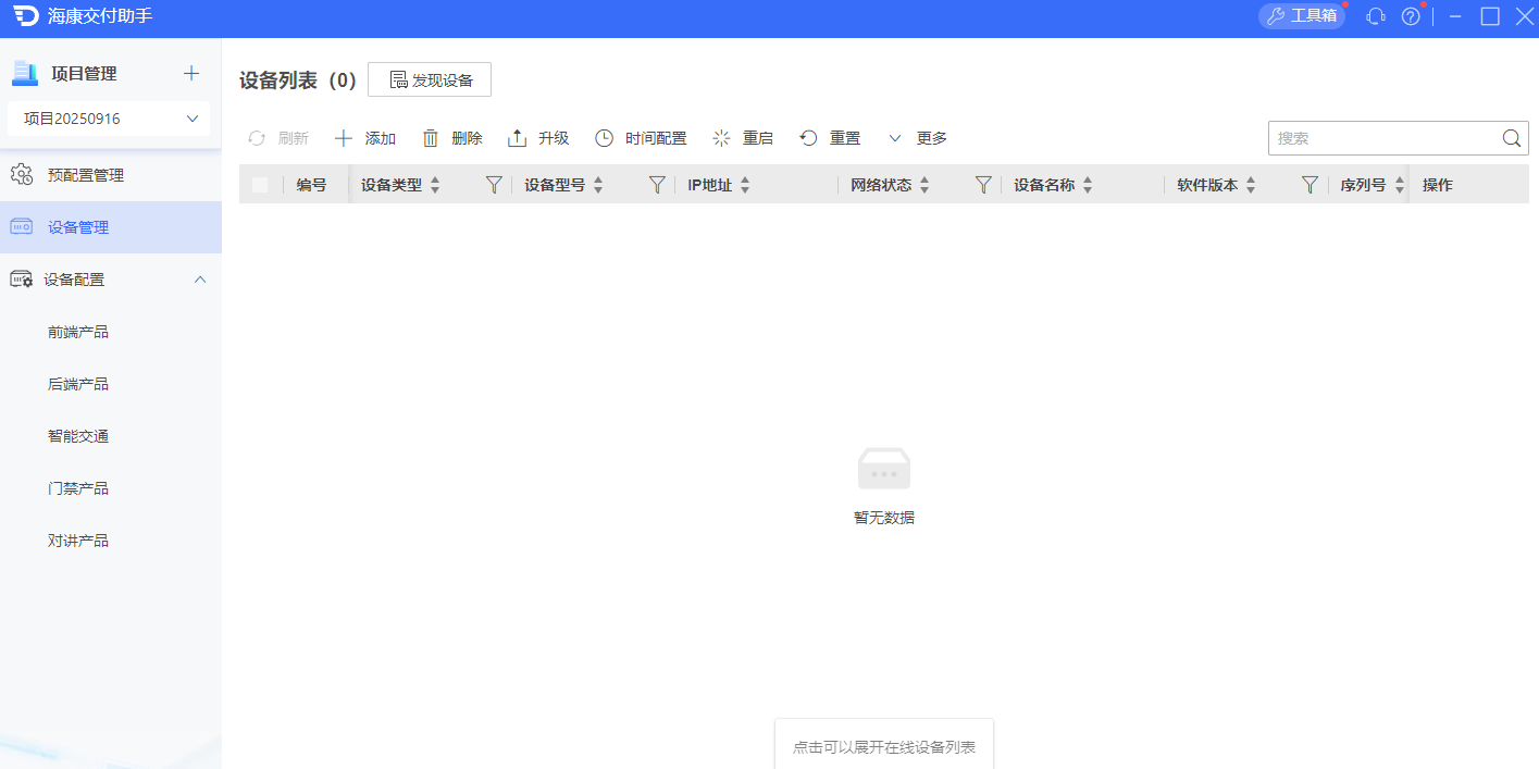 海康交付助手是集设备管理、参数配置、设备状态检测等功能为一体的软件, 面向交付人员(如安装商、服务商、集成商、技术人员),支持批量添加、激活、升级、配置视频设备、 网络视频录像机、门禁设备、可视对讲设备、智能交通设备、音频传感设备、出入口led显示屏、车位管理led显示屏 、分布式多屏控制器、报警设备、网络设备、智慧屏、视频会议等设备,同时支持使用配置模板一键下发配置,可简化交付过程,设备配置完成后,可导出项目的设备清单,用于后续维护。