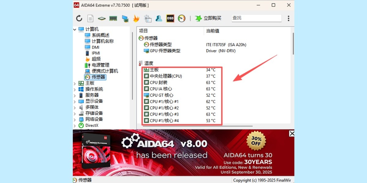 aida64 支持超过150个的各种传感器设备来测量温度,电压,风扇速度和功率消耗。测量值可显示在系统托盘图标,osd面板,边栏小工具,和罗技g15/g19游戏键盘lcd。的值也可以被记录到文件或出口到外部应用程序,如rivatuner中或武士。 aida64也可以报警用户,当它检测到过热,过电压,或冷却风扇故障。