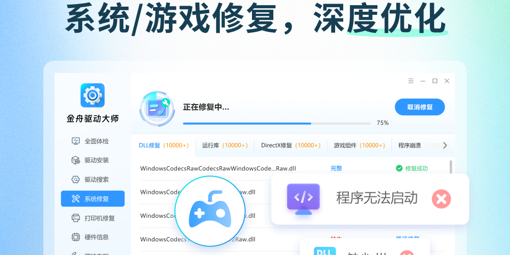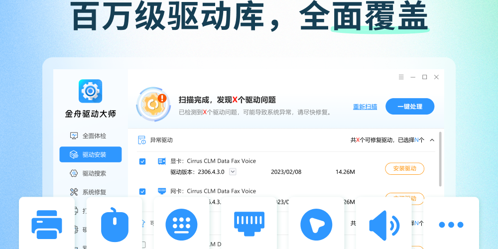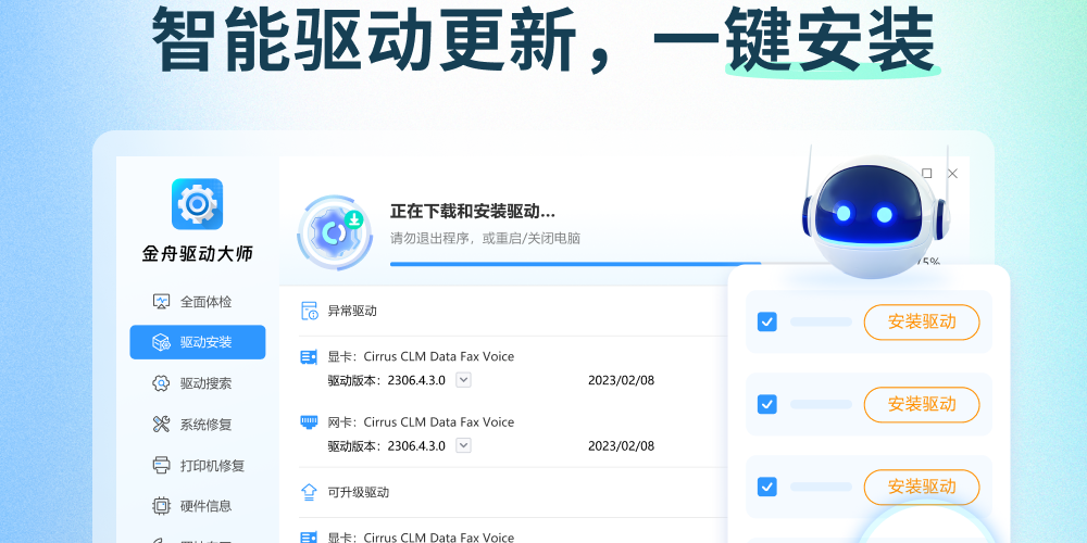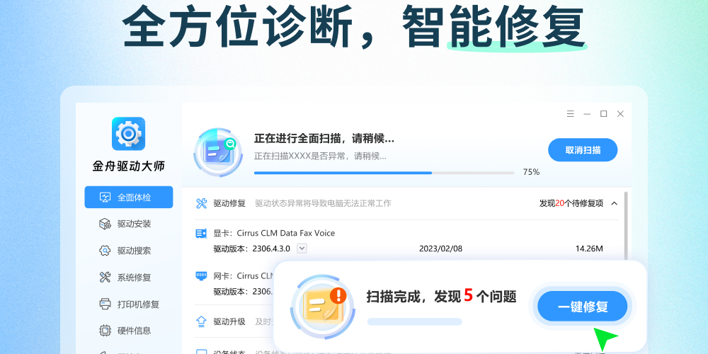 万能驱动,驱动下载,驱动更新,驱动程序,打印机驱动,dll系统修复;金舟驱动大师是一款全面而高效的驱动管理工具,旨在为用户提供一站式的驱动更新解决方案。它不仅能帮您解决显卡驱动、声卡驱动、网卡驱动安装,还扩展到了电脑系统修复、打印机驱动修复等实用场景,满足用户对电脑驱动管理和修复的多样化需求。