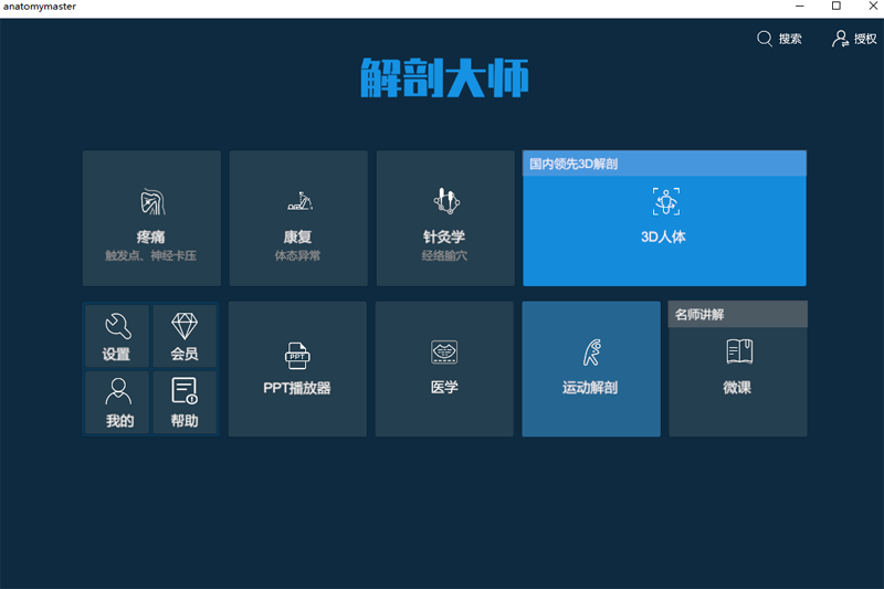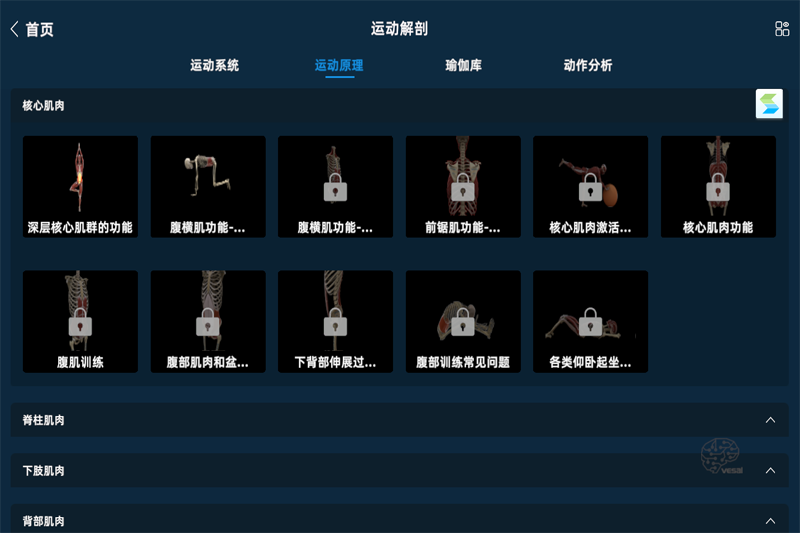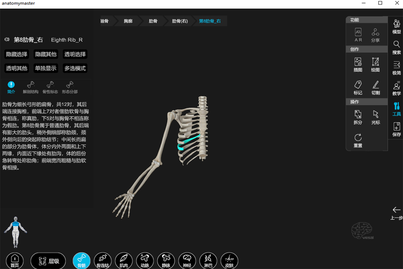 1、3d人体解剖模型库,包含解剖模型(整体、头颈、胸部、背部、四肢、腹部、骨盆、八大系统)、临床模型(肌肉链、脊柱与关节、多关节、心脏、感觉器)