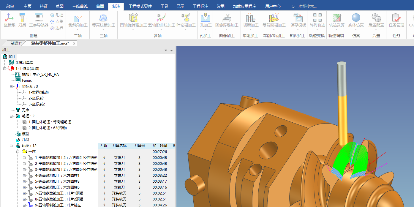 四轴、多轴加工模块:提供四轴旋转加工、四轴柱面曲线和螺旋线加工、型腔区域加工、参数线平行线限制线加工、平行面限制面加工、侧刃铣削加工等多种4~5轴加工策略,可以满足各种多轴编程加工场景应用。