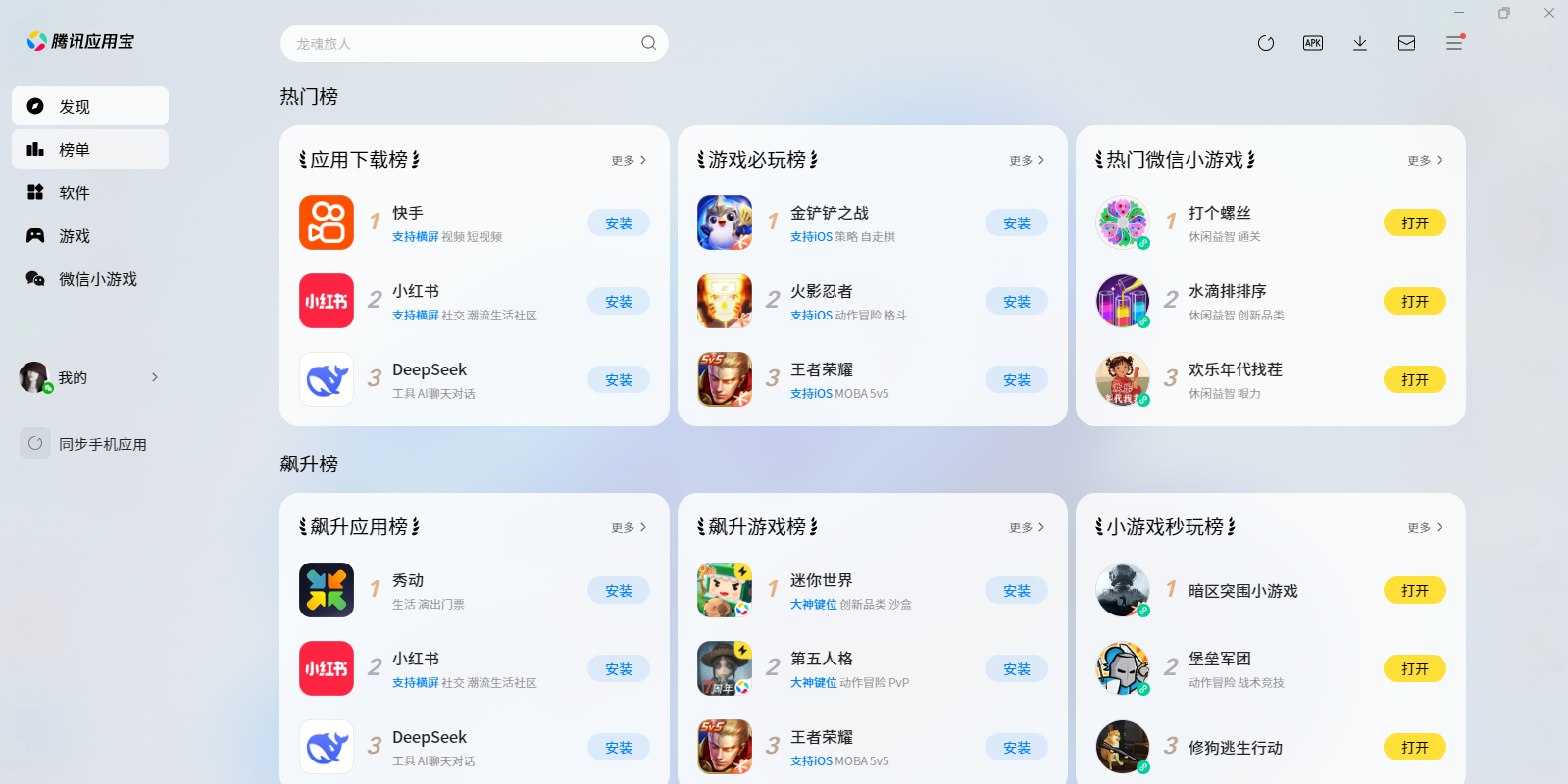 应用宝电脑版,一款在电脑上畅玩手机app的软件,包括移动软件,移动游戏,小程序和小游戏。现在,在电脑上使用鼠标,大屏幕来刷视频,看小说,玩游戏,享受更沉浸畅快的体验吧。我们使用了先进的腾讯移动引擎技术,移动应用启动速度更快,操作更流畅。拥有海量的移动软件库,无论是移动app、手机游戏、还是微信小程序、微信小游戏,您现在都可以在电脑上直接打开了。支持高画质,高流畅度的云游体验,您现在无需下载即可通过云游戏在电脑上畅玩王者荣耀、和平精英。