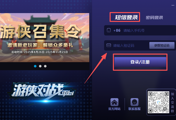 ●不是游侠用户,需要注册账号,选择【短信登录】,未注册过的账号可直接注册成功。