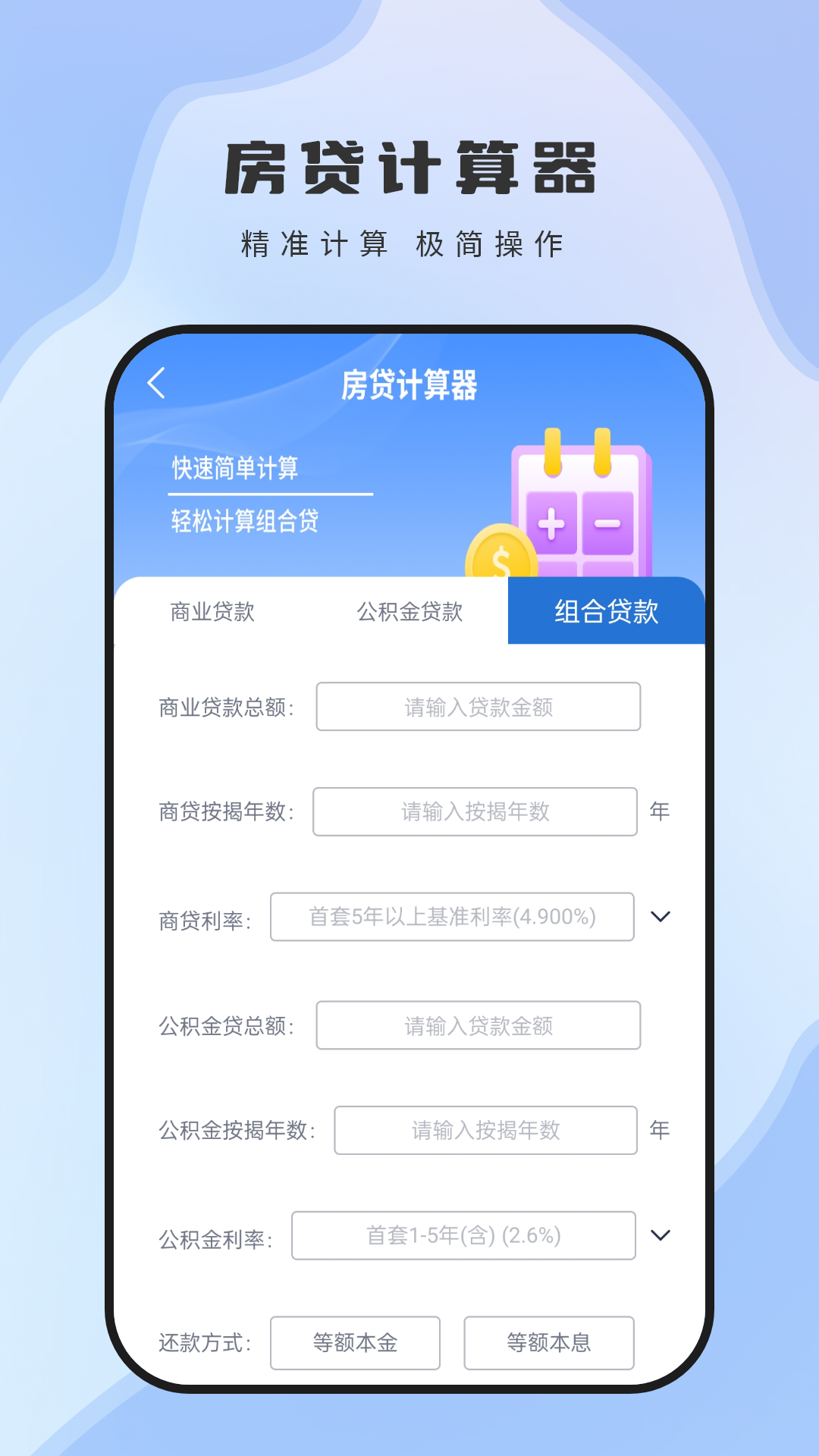 房贷计算器——商业贷款计算、公积金贷款计算、组合贷款计算,选择您需要使用的计算方式,输入计算金额,即可为您计算所需贷款金额和利息等数据。