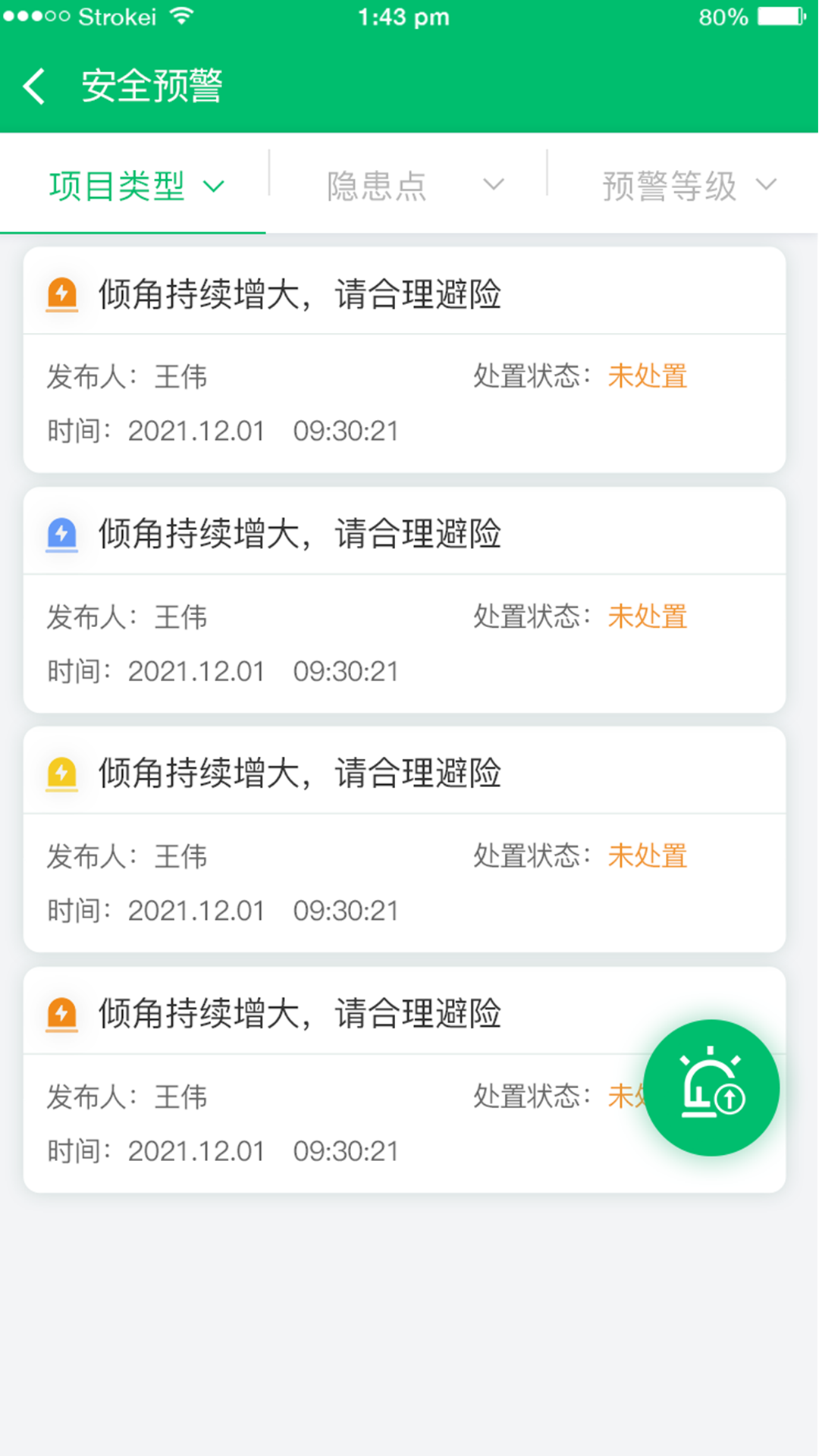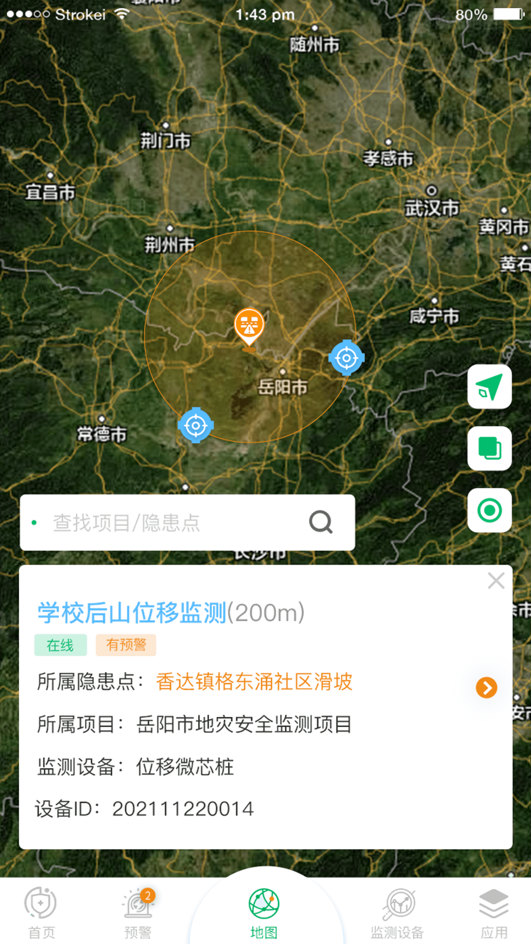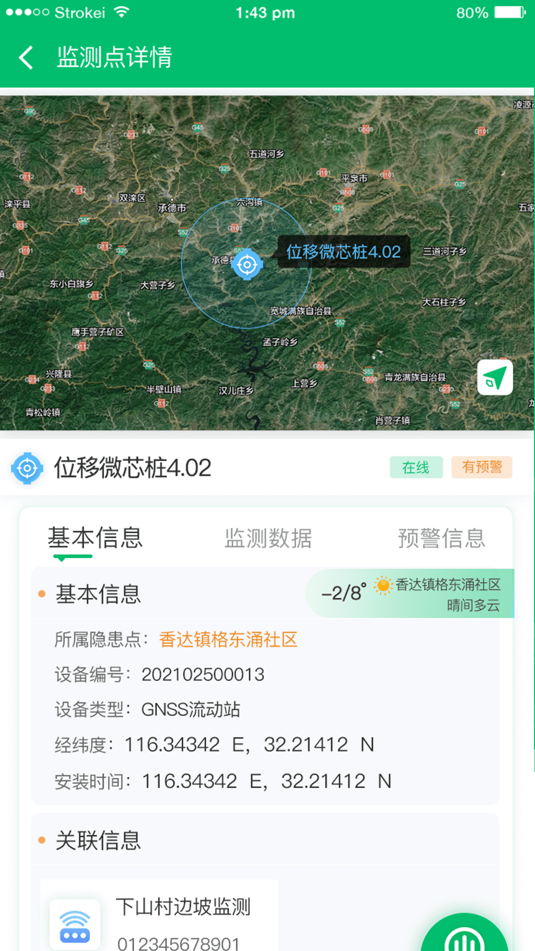 安全卫士app(android)功能包括实时预警、防灾地图、项目列表,主要用于用户查看我的项目及添加关注项目、实时关注项目隐患点、监测点的风险警报信息,实时收到微芯桩、微芯链等专业地质灾害监测设备推送的预警信息。