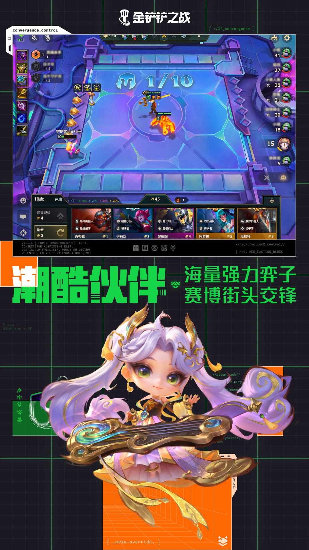 《金铲铲之战》是英雄联盟云顶之弈正版授权的自动战斗品类手游,每局比赛由八名玩家共同进行一场各自为战的博弈对抗,玩家通过招兵买马,融合英雄,提升战力,排兵布阵,成为最终立于战场上的赢家。