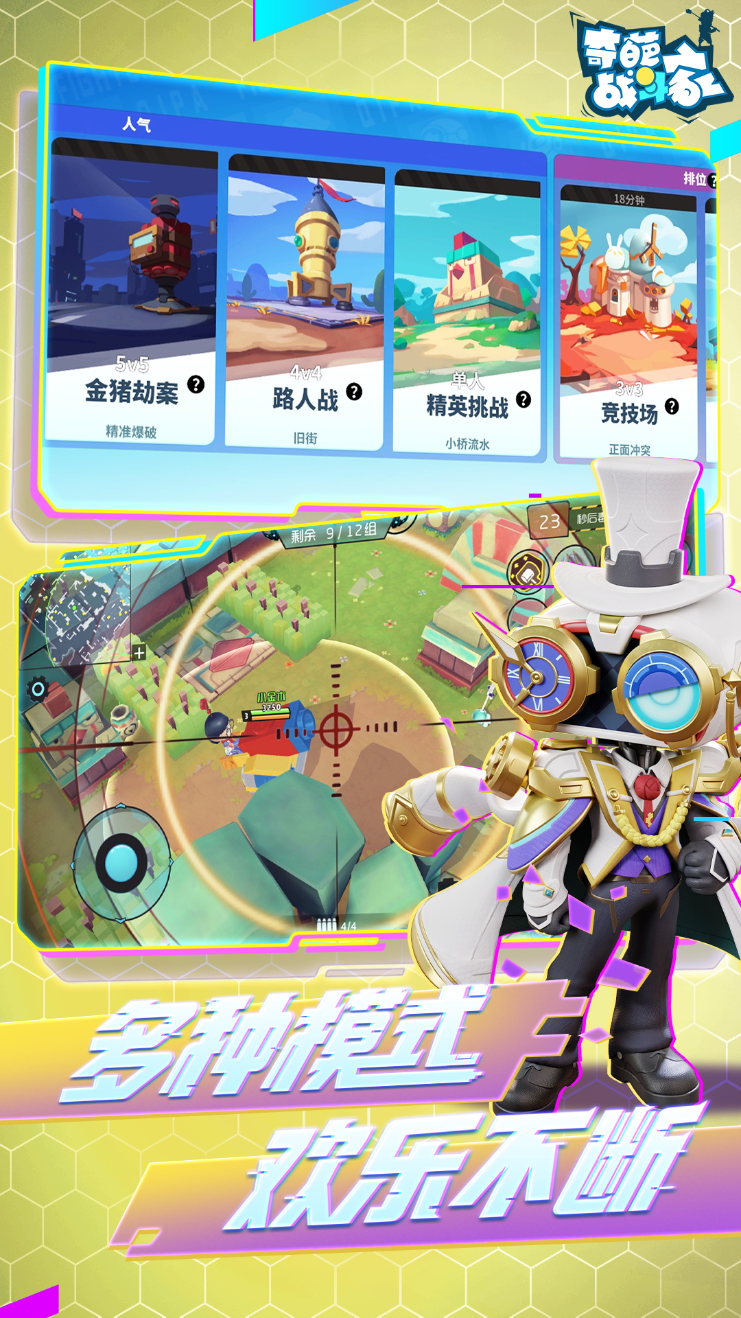 欢乐很简单,只需五分钟!多种模式选择,快乐从不单一,从3v3经典乱斗,4v4淘金热,奇葩足球趣味玩法,单人双人搞笑精英挑战,不服solo的1v1单挑局,可以rush b的5v5的金猪劫案!还有排位和锦标赛,看看谁才是真正的战斗专家!