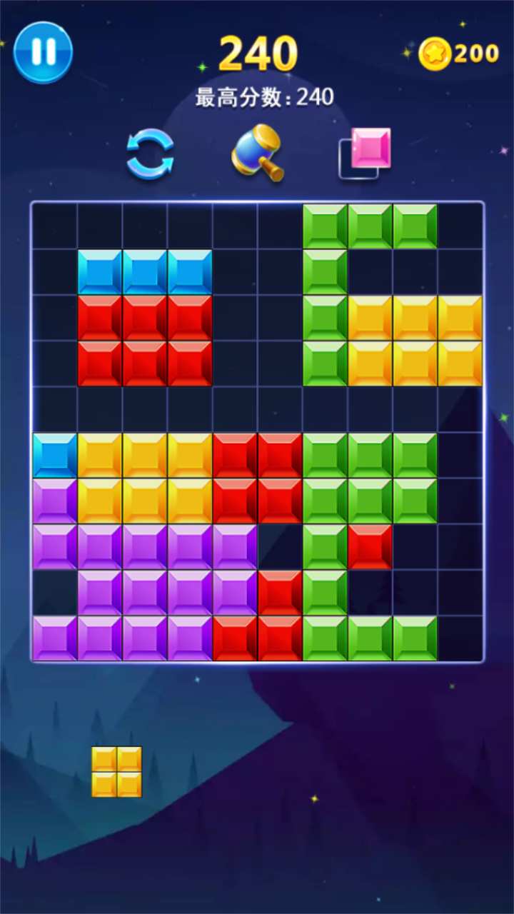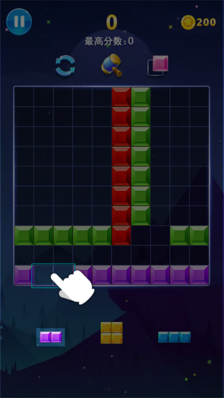 拖动模式:固定格局中拖动方块放置,每次出现3个方块,直至出现方块不能放下游戏结束;