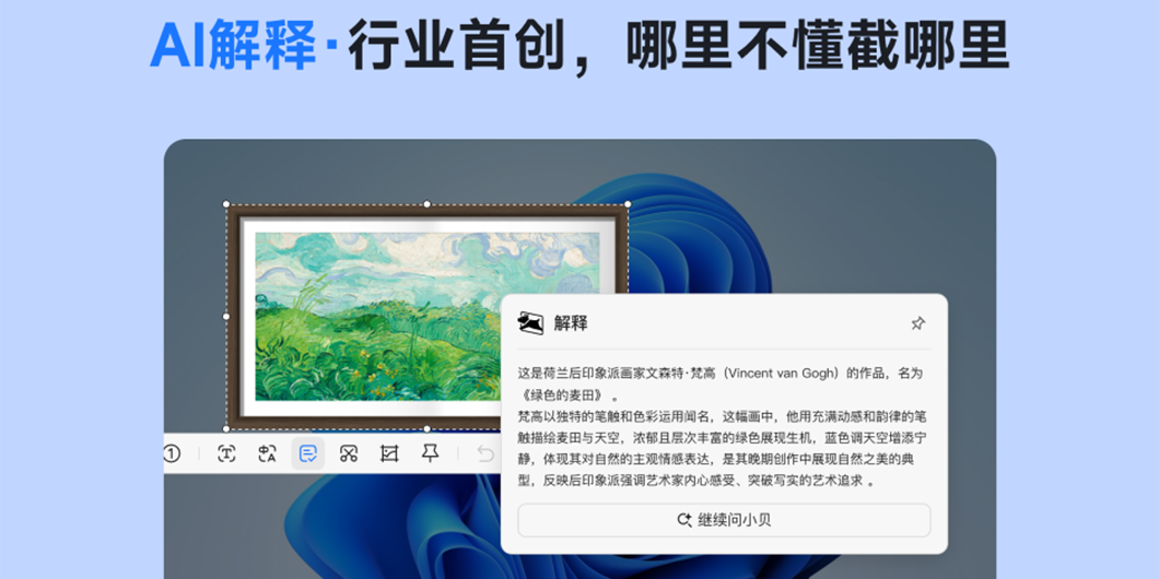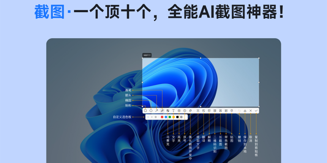 小旺ai截图是一款免费电脑截图软件,并支持ai截图和录屏神器,功能包括:截图、贴图、长截图、带壳截图、截图翻译、ocr文字提取、gif动图、录屏、ai解释、数字标注、取色等。