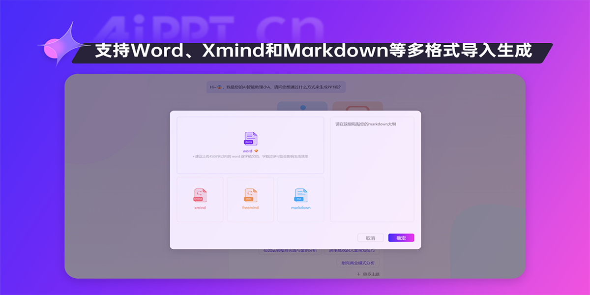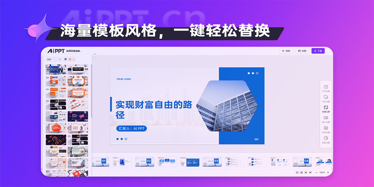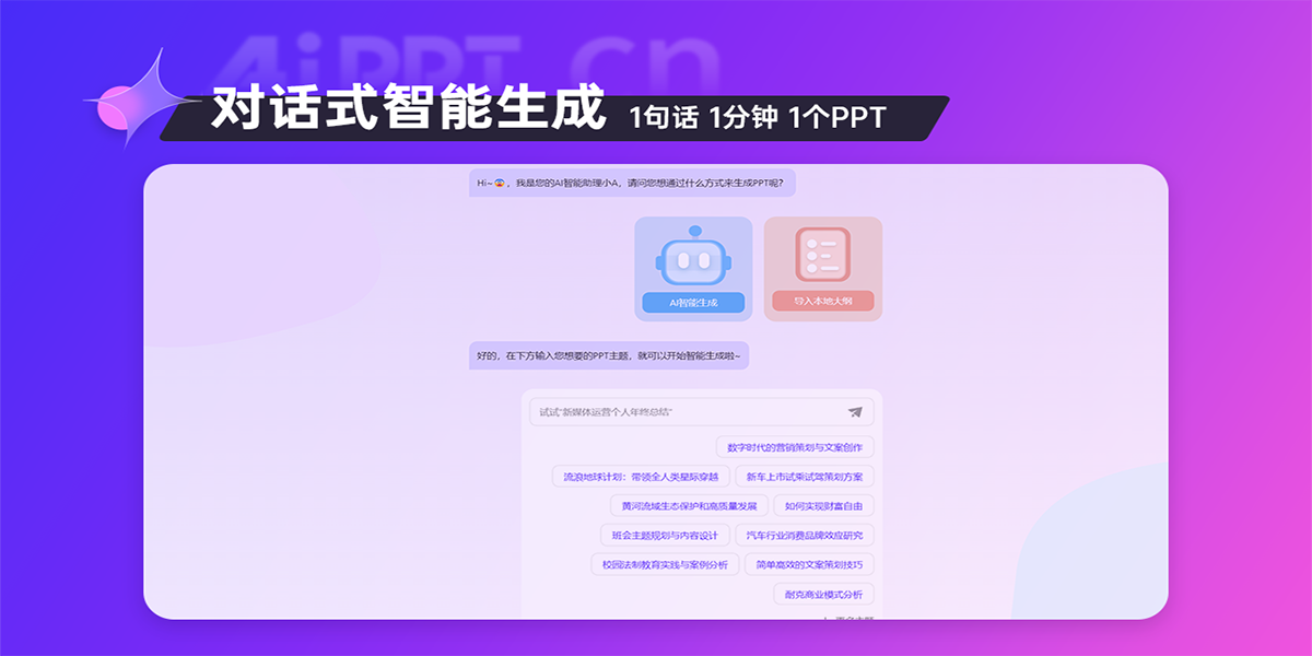 aippt结合最新ai技术,为用户提供一键生成高质量ppt的解决方案。无论是职场展示、教育课件还是销售报告,aippt均能快速生成符合需求的专业ppt,简化设计流程,提升工作效率。