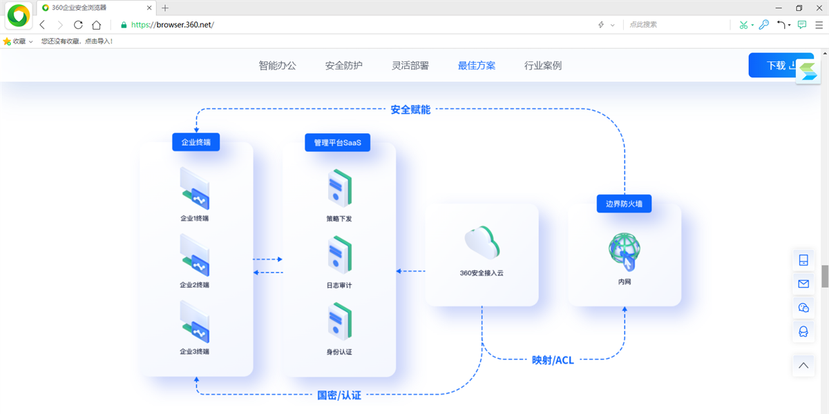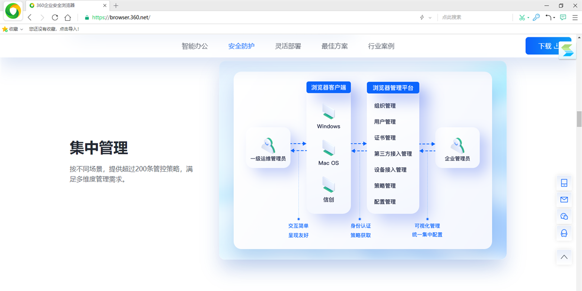 企业受到的攻击大多通过浏览器进行,为此,360 企业安全浏览器不但继承了360安全浏览器原有的安全防护能力,还针对企业场景注入360安全大脑的核心能力,为终端安全、通讯安全、上网安全、行为安全、数据安全等多个维度提供防护机制,并将业务相关的安全策略开放给管理员统一管理,提升了办公场景中的整体安保能力。