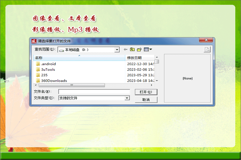 万能文件查看器支持图像文件、文本文件、声音文件、影像文件、幻灯片、swf动画并且能自动调用其它文件:doc、xls、chm等文件;安装一个万能文件查看器相当于安装了图像浏览软件、文本查看器、mp3播放器、影像播放器(各种影像)、swf动画播放器等。