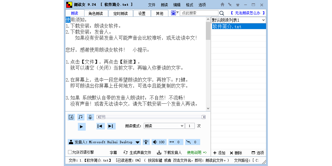 朗读女是一个非常简单实用的语音朗读软件。您可以用它来朗读文本文件、小说、学习外语、语音报时、校对文章、读网页新闻等(凡是屏幕上可选中且能复制的文本它都能朗读),还可以用它来制作有声小说和学习资料音频等(它支持生成mp3与及wav格式的声音文件)。