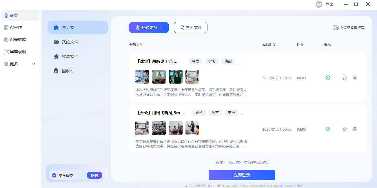 讯飞听见mac版,免费实时录音转文字,同时记录电脑发出声音与麦克风声音,支持多语种翻译、云会议、智能硬件等多种功能。可满足日常办公会议、授课演讲、媒体采访、心得写作等多场景下的录音转文字及翻译需求。支持在线录音实时转写及翻译,外部音频上传转文字等功能。文字结果支持角色分离、智能分段、字音同步编辑,重点标记、高效分享等,全面提升工作效率。