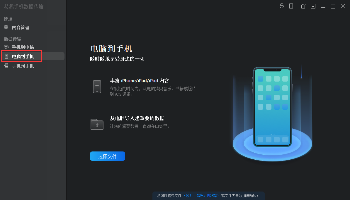 易我手机数据传输软件让用户在iphone和电脑之间传输文档不受阻碍。值得信赖的ios数据传输软件配备多种功能,满足用户传输照片、视频、音乐、日历、联络人、电子书或音频等不同的需求。