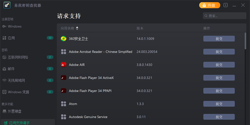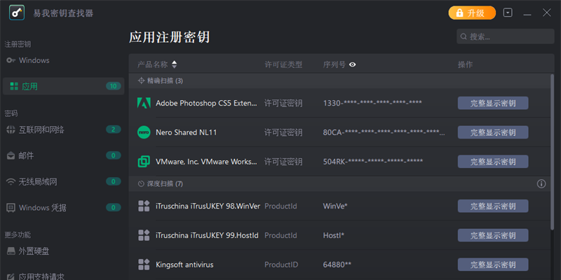 除了查询微软office和adobe的产品密钥,你还可以应用易我密钥查找器来恢复多种流行软件的序列号。