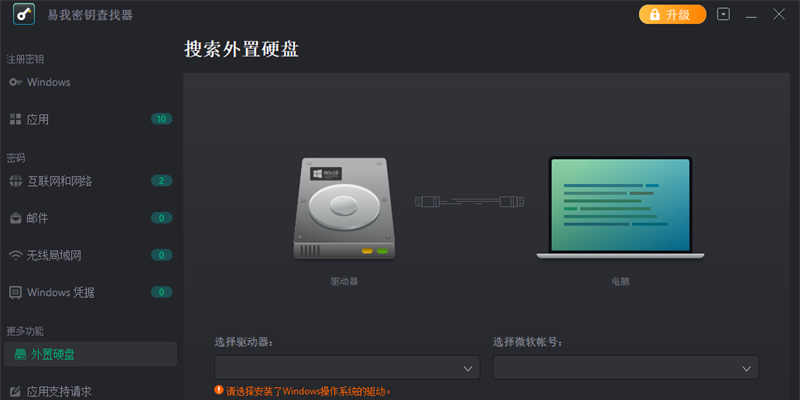 易我密钥查找器可以从崩溃的windows操作系统或无法启动的磁盘(hdd/ssd)中查询产品密钥。