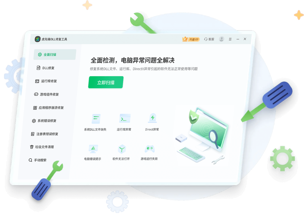 虎先锋dll修复,一键修复电脑软件和游戏缺失dll、directx导致的崩溃、卡顿、故障等问题,解决各类运行库、directx错误和dll缺失问题。