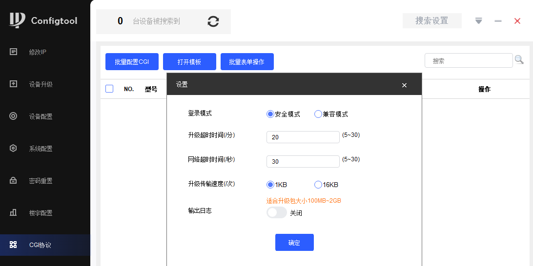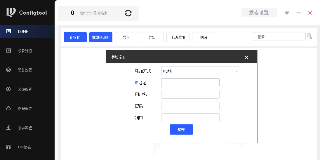 configtool主要对支持大华二、三代协议的大华设备进行配置,支持设备的信息查看、单个/批量修改ip、详细参数配置、校时、重启、恢复默认、修改密码、设备升级、楼宇对讲配置、密码重置、cgi配置等功能。